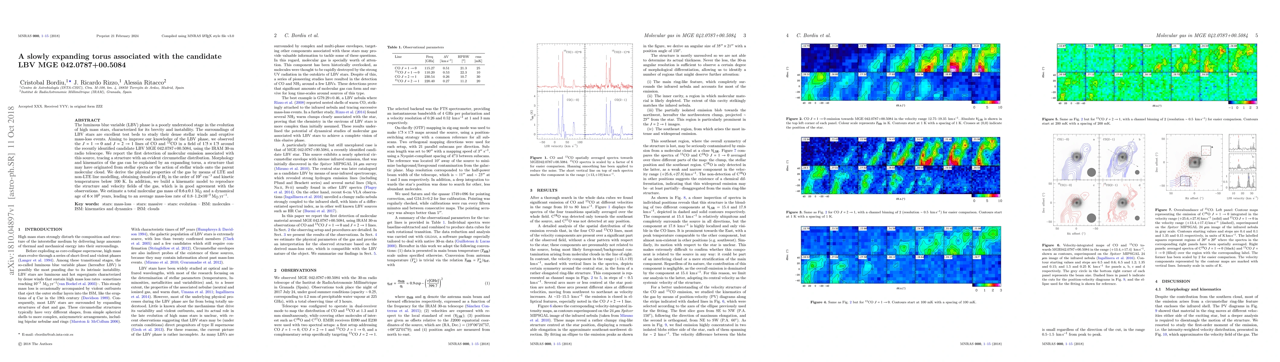 The luminous blue variable (LBV) phase is a poorly understood stage in the evolution of high mass stars, characterized for its brevity and instability. The surroundings of LBV stars are excellent test beds to study their dense stellar winds and eruptive mass-loss events. Aiming to improve our knowledge of the LBV phase, we observed the J=1-0 and J=2-1 lines of CO and $^{13}$CO in a field of 1.5'x1.5' around the recently identified candidate LBV MGE 042.0787+00.5084, using the IRAM 30-m radio telescope. We report the first detection of molecular emission associated with this source, tracing a structure with an evident circumstellar distribution. Morphology and kinematics of the gas can be explained by an expanding torus, a structure that may have originated from stellar ejecta or the action of stellar winds onto the parent molecular cloud. We derive the physical properties of the gas by means of LTE and non-LTE line modelling, obtaining densities of H$_2$ in the order of 10$^3$ cm$^{-3}$ and kinetic temperatures below 100 K. In addition, we build a kinematic model to reproduce the structure and observed velocity fields of the gas, which is in good agreement with the observations. We estimate a total molecular gas mass of 0.6$\pm$0.1 Msun and a dynamical age of 6$\times$10$^4$ years, leading to an average mass-loss rate of 0.8-1.2$\times$10$^{-5}$ Msun yr$^{-1}$.
