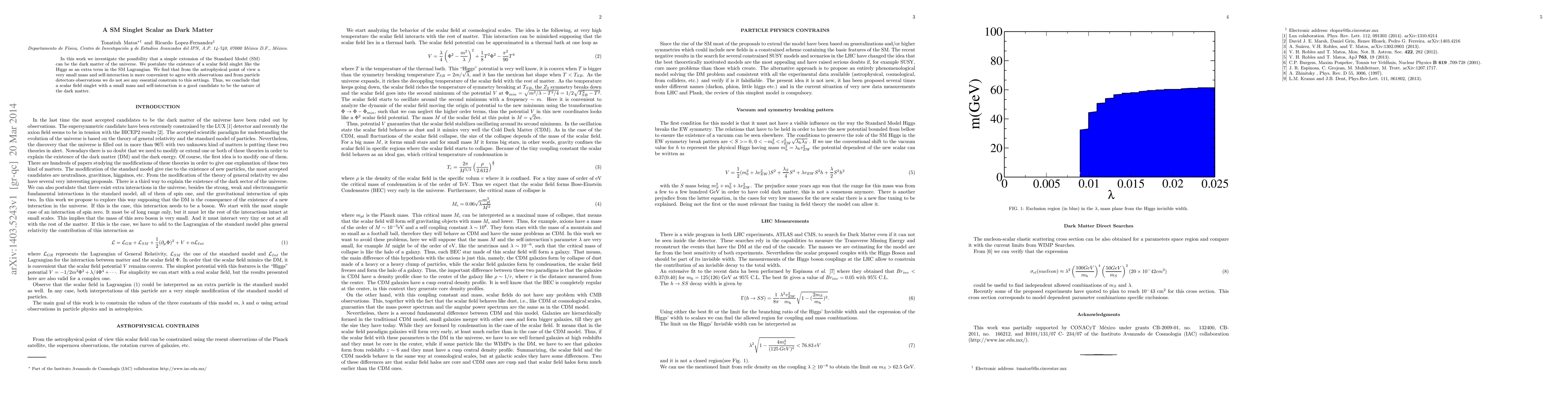 In this work we investigate the possibility that a simple extension of the Standard Model (SM) can be the dark matter of the universe. We postulate the existence of a scalar field singlet like the Higgs as an extra term in the SM Lagrangian. We find that from the astrophysical point of view a very small mass and self-interaction is more convenient to agree with observations and from particle detectors observations we do not see any essential constrain to this settings. Thus, we conclude that a scalar field singlet with a small mass and self-interaction is a good candidate to be the nature of the dark matter.