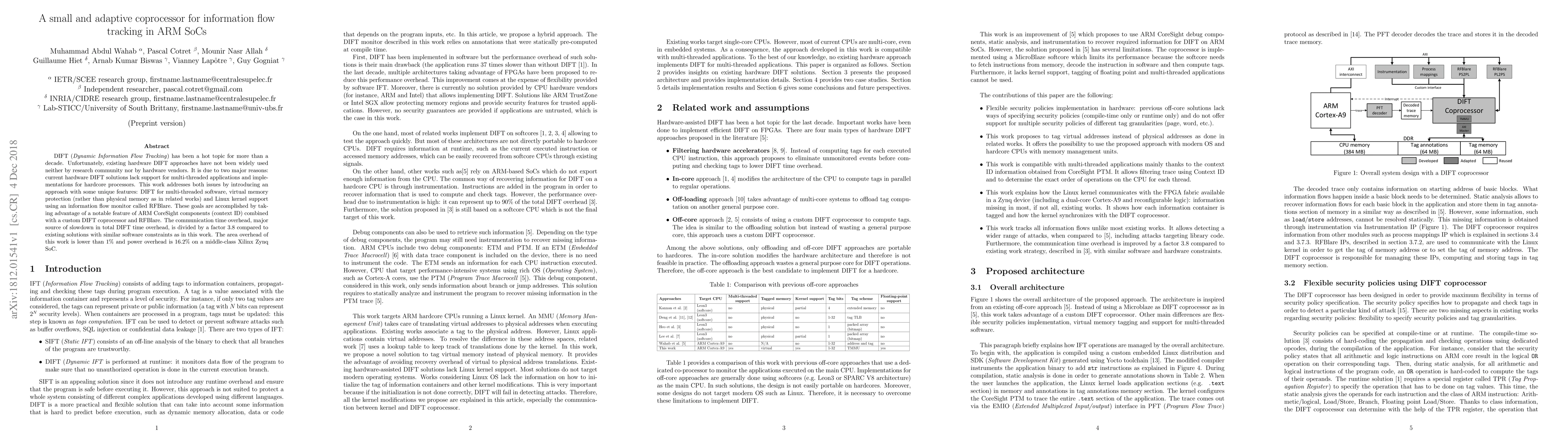 This paper introduces a small, adaptive coprocessor for Dynamic Information Flow Tracking (DIFT) in ARM SoCs, addressing the lack of support for multi-threaded applications and hardcore processors. The proposed solution, RFBlare, leverages ARM CoreSight components and a custom DIFT coprocessor, achieving a 3.8x reduction in communication time overhead and less than 1% area overhead.