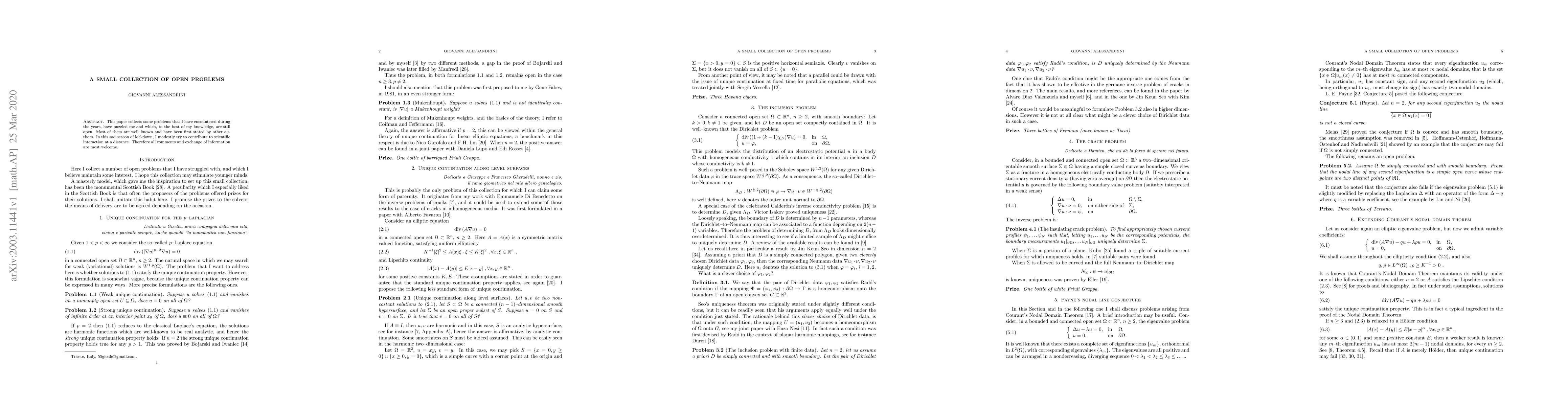 This research paper collects and discusses open problems encountered by the author over the years, focusing on topics such as unique continuation for parabolic equations, the Calderón problem of determining conductivity, the inclusion problem in electrostatics, Payne's nodal line conjecture, extending Courant's nodal domain theorem to variable coefficients, and a parabolic inverse problem.