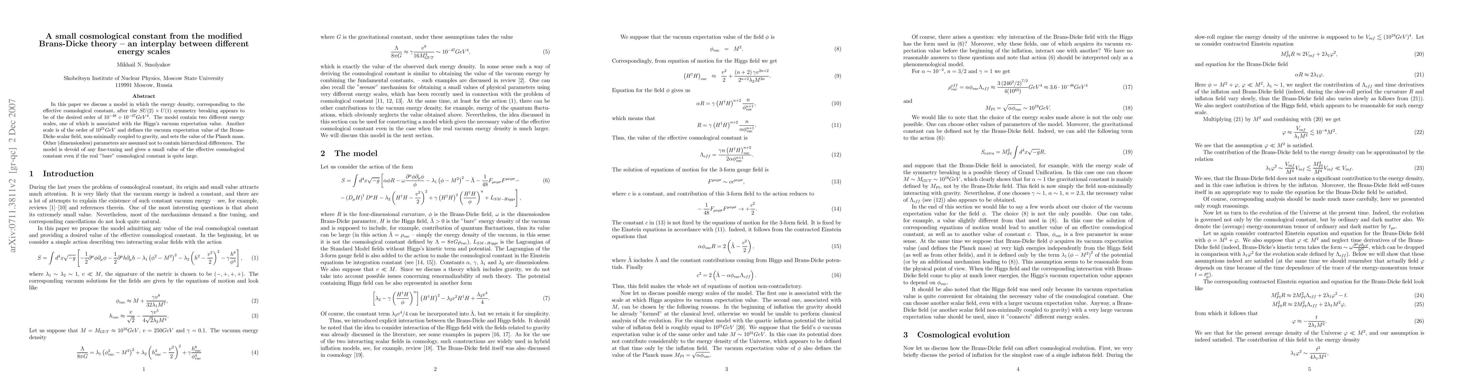 In this paper we discuss a model in which the energy density, corresponding to the effective cosmological constant, after the $SU(2)\times U(1)$ symmetry breaking appears to be of the desired order of $10^{-48}\div 10^{-47} GeV^{4}$. The model contain two different energy scales, one of which is associated with the Higgs's vacuum expectation value. Another scale is of the order of $10^{21}GeV$ and defines the vacuum expectation value of the Brans-Dicke scalar field, non-minimally coupled to gravity, and sets the value of the Planck mass. Other (dimensionless) parameters are assumed not to contain hierarchical differences. The model is devoid of any fine-tuning and gives a small value of the effective cosmological constant even if the real "bare" cosmological constant is quite large.