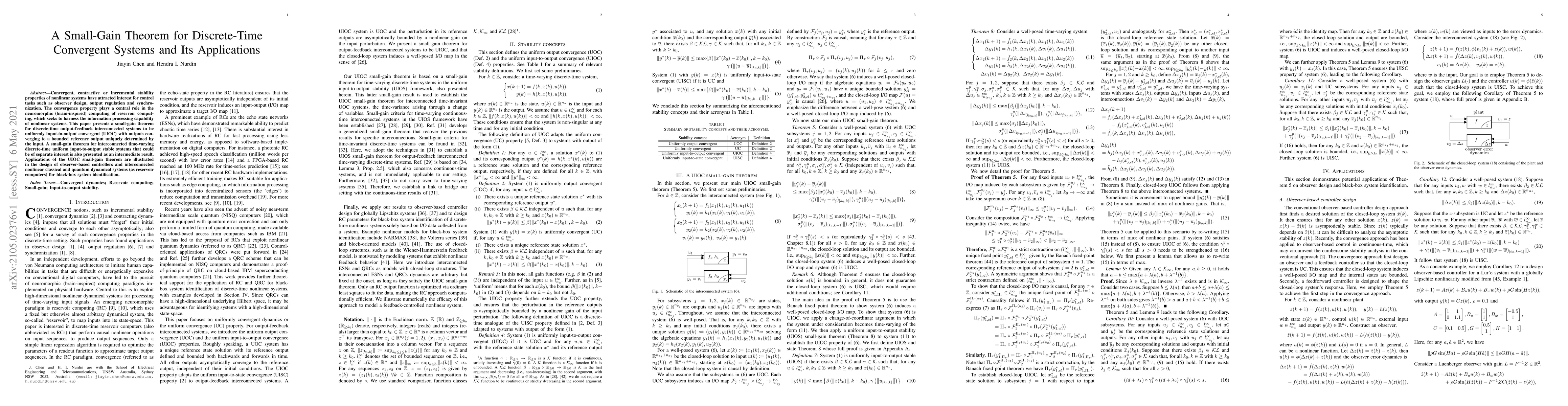 This paper introduces a small-gain theorem for discrete-time convergent systems, ensuring uniform input-to-output convergence, and applies it to observer-based controller design and reservoir computing for neuromorphic and quantum systems identification. The theorem also includes an intermediate result for time-varying systems.