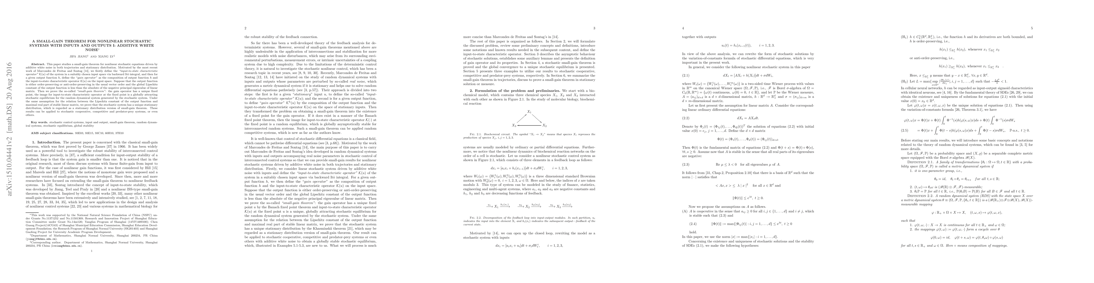 This paper studies a small-gain theorem for nonlinear stochastic equations driven by additive white noise in both trajectories and stationary distribution. Motivated by the most recent work of Marcondes de Freitas and Sontag \cite{FS3}, we firstly define the {\it "input-to-state characteristic operator"} $\mathcal{K}(u)$ of the system in a suitably chosen input space via backward It\^o integral, and then for a given output function $h$, define the $"gain\ operator"$ as the composition of output function $h$ and the input-to-state characteristic operator $\mathcal{K}(u)$ on the input space. Suppose that the output function is either order-preserving or anti-order-preserving in the usual vector order and the global Lipschitz constant of the output function is less than the absolute of the negative principal eigenvalue of linear matrix. Then we prove the so-called {\it "small-gain theorem"}: the gain operator has a unique fixed point, the image for input-to-state characteristic operator at the fixed point is a globally attracting stochastic equilibrium for the random dynamical system generated by the stochastic system. Under the same assumption for the relation between the Lipschitz constant of the output function and maximal real part of stable linear matrix, we prove that the stochastic system has a unique stationary distribution, which is regarded as a stationary distribution version of small-gain theorem. These results can be applied to stochastic cooperative, competitive and predator-prey systems, or even others.