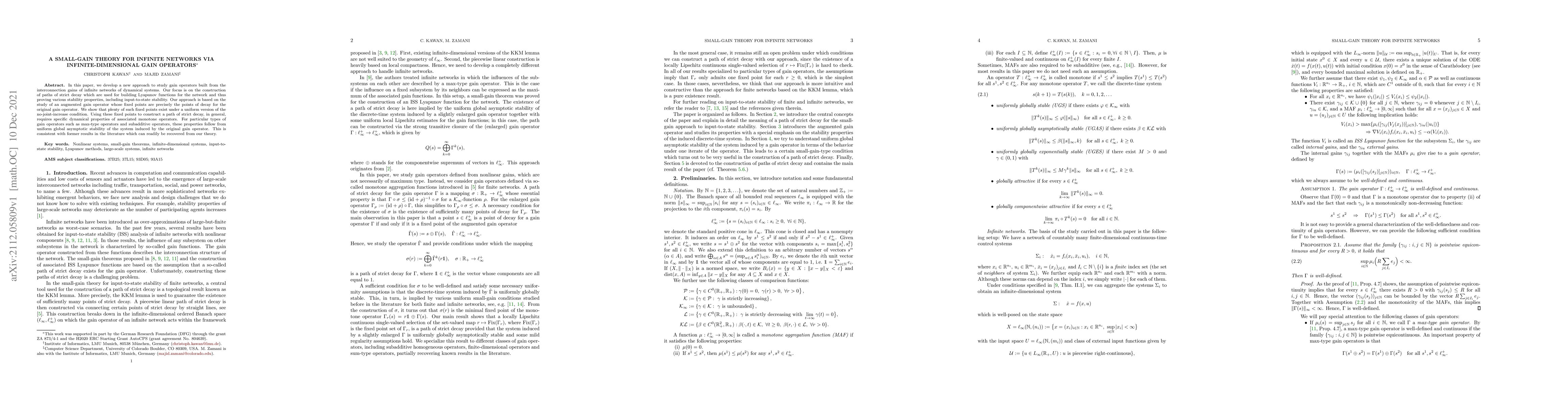 In this paper, we develop a new approach to study gain operators built from the interconnection gains of infinite networks of dynamical systems. Our focus is on the construction of paths of strict decay which are used for building Lyapunov functions for the network and thus proving various stability properties, including input-to-state stability. Our approach is based on the study of an augmented gain operator whose fixed points are precisely the points of decay for the original gain operator. We show that plenty of such fixed points exist under a uniform version of the no-joint-increase condition. Using these fixed points to construct a path of strict decay, in general, requires specific dynamical properties of associated monotone operators. For particular types of gain operators such as max-type operators and subadditive operators, these properties follow from uniform global asymptotic stability of the system induced by the original gain operator. This is consistent with former results in the literature which can readily be recovered from our theory.