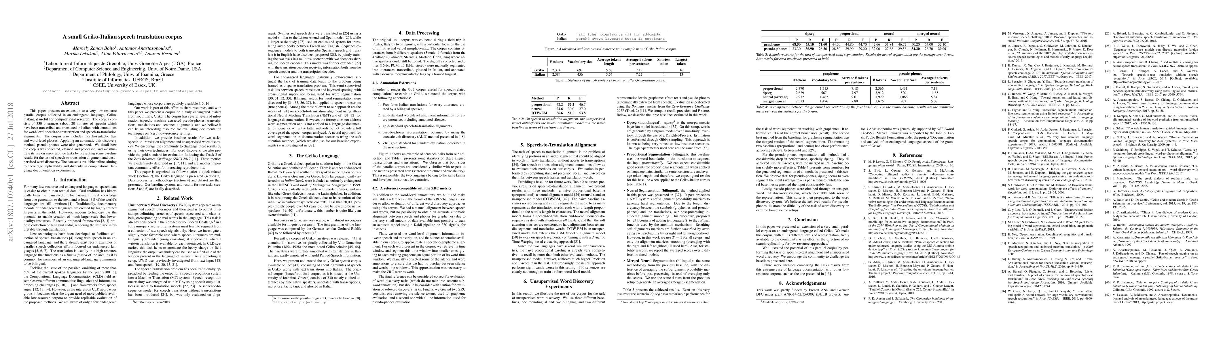 This paper introduces a small Griko-Italian speech translation corpus of 330 utterances, annotated for alignment and morphosyntactic tags, and demonstrates its utility in zero-resource tasks by presenting baseline results for speech-to-translation alignment and unsupervised word discovery. The corpus is available online to promote replicability in computational language documentation.