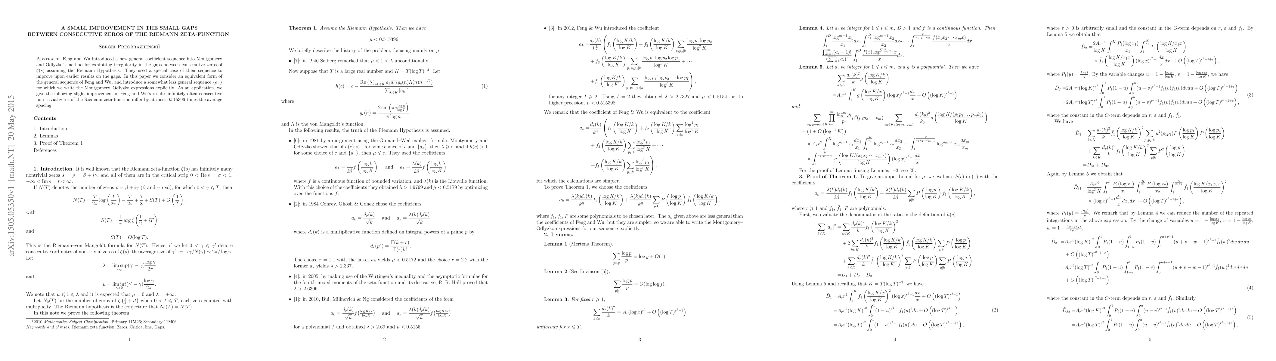 Feng and Wu introduced a new general coefficient sequence into Montgomery and Odlyzko's method for exhibiting irregularity in the gaps between consecutive zeros of $\zeta(s)$ assuming the Riemann Hypothesis. They used a special case of their sequence to improve upon earlier results on the gaps. In this paper we consider an equivalent form of the general sequence of Feng and Wu, and introduce a somewhat less general sequence $\{a_n\}$ for which we write the Montgomery-Odlyzko expressions explicitly. As an application, we give the following slight improvement of Feng and Wu's result: infinitely often consecutive non-trivial zeros of the Riemann zeta-function differ by at most $0{.}515396$ times the average spacing.