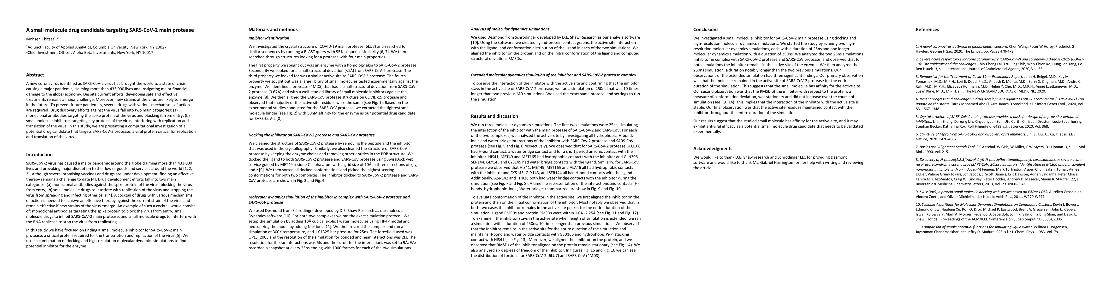 A new coronavirus identified as SARS-CoV-2 virus has brought the world to a state of crisis, causing a major pandemic, claiming more than 433,000 lives and instigating major financial damage to the global economy. Despite current efforts, developing safe and effective treatments remains a major challenge. Moreover, new strains of the virus are likely to emerge in the future. To prevent future pandemics, several drugs with various mechanisms of action are required. Drug discovery efforts against the virus fall into two main categories: (a) monoclonal antibodies targeting the spike protein of the virus and blocking it from entry; (b) small molecule inhibitors targeting key proteins of the virus, interfering with replication and translation of the virus. In this study, we are presenting a computational investigation of a potential drug candidate that targets SARS-CoV-2 protease, a viral protein critical for replication and translation of the virus.