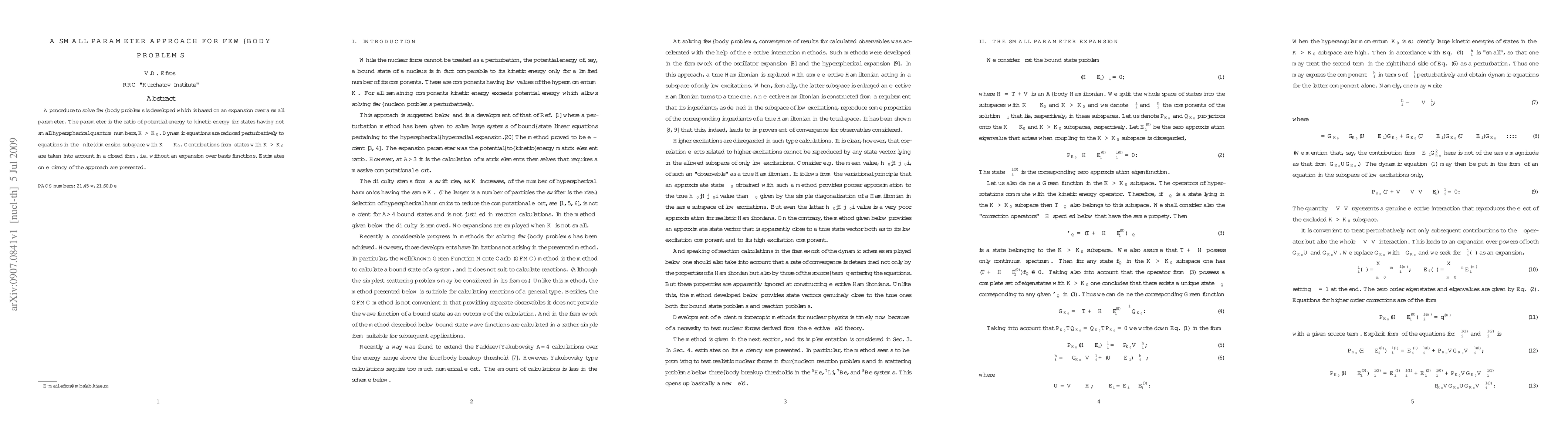 A procedure to solve few-body problems is developed which is based on an expansion over a small parameter. The parameter is the ratio of potential energy to kinetic energy for states having not small hyperspherical quantum numbers, K>K_0. Dynamic equations are reduced perturbatively to equations in the finite-dimension subspace with K\le K_0. Contributions from states with K>K_0 are taken into account in a closed form, i.e. without an expansion over basis functions. Estimates on efficiency of the approach are presented.
