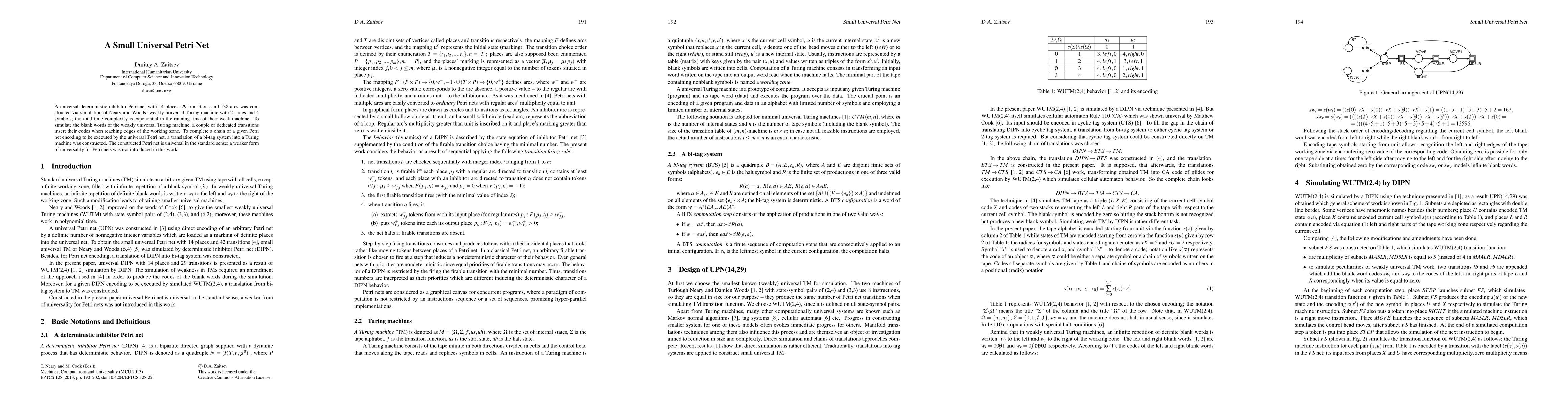 This paper constructs a small universal deterministic inhibitor Petri net with 14 places and 29 transitions, simulating Neary and Woods' weakly universal Turing machine. The translation process from a bi-tag system to a Turing machine completes the chain for the Petri net's execution, with an exponential time complexity.
