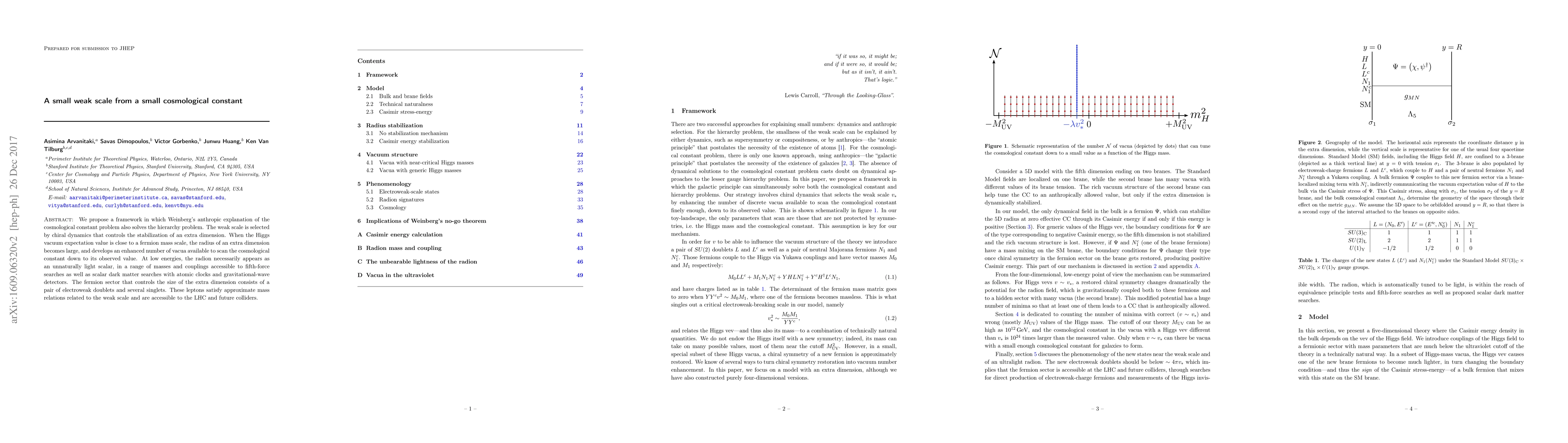 This paper proposes a framework where Weinberg's anthropic explanation of the cosmological constant problem also addresses the hierarchy problem, suggesting that chiral dynamics stabilize an extra dimension, leading to a naturally small weak scale. The model predicts a light radion and specific lepton mass relations, testable at colliders and dark matter experiments.