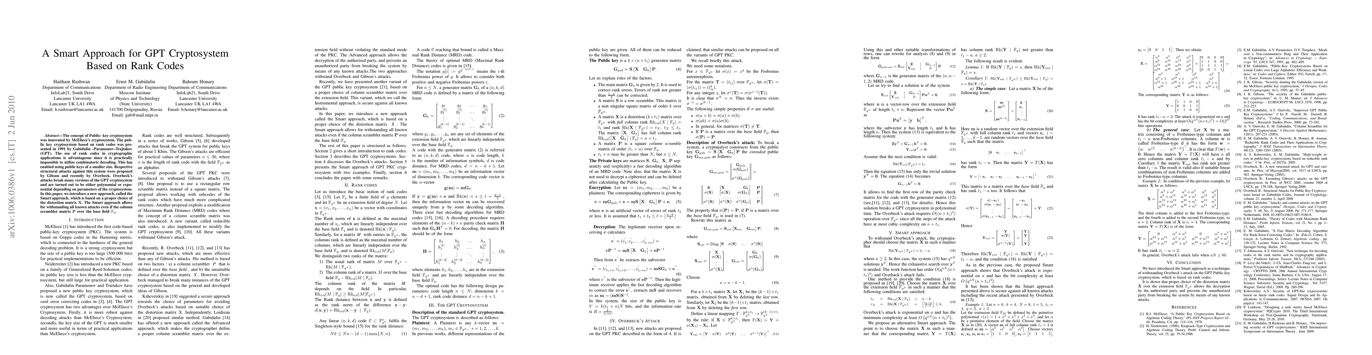This paper proposes a novel "Smart approach" for the GPT cryptosystem based on rank codes, aiming to counter structural attacks by carefully selecting the distortion matrix X. This method is designed to resist known attacks, including those proposed by Overbeck, by utilizing a column scrambler matrix P.