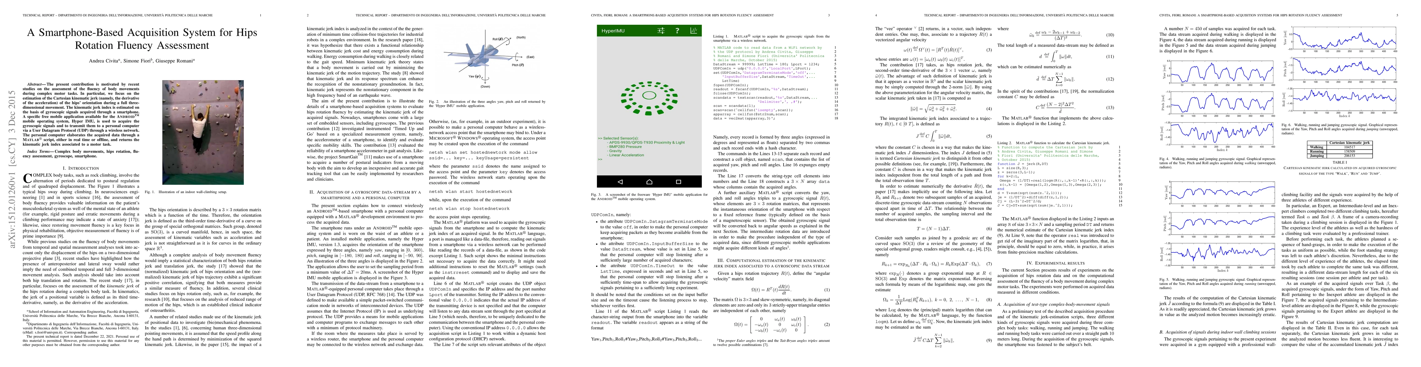 The present contribution is motivated by recent studies on the assessment of the fluency of body movements during complex motor tasks. In particular, we focus on the estimation of the Cartesian kinematic jerk (namely, the derivative of the acceleration) of the hips' orientation during a full three-dimensional movement. The kinematic jerk index is estimated on the basis of gyroscopic signals acquired through a smartphone. A specific free mobile application available for the Android mobile operating system, HyperIMU, is used to acquire the gyroscopic signals and to transmit them to a personal computer via a User Datagram Protocol (UDP) through a wireless network. The personal computer elaborates the acquired data through a MATLAB script, either in real time or offline, and returns the kinematic jerk index associated to a motor task.