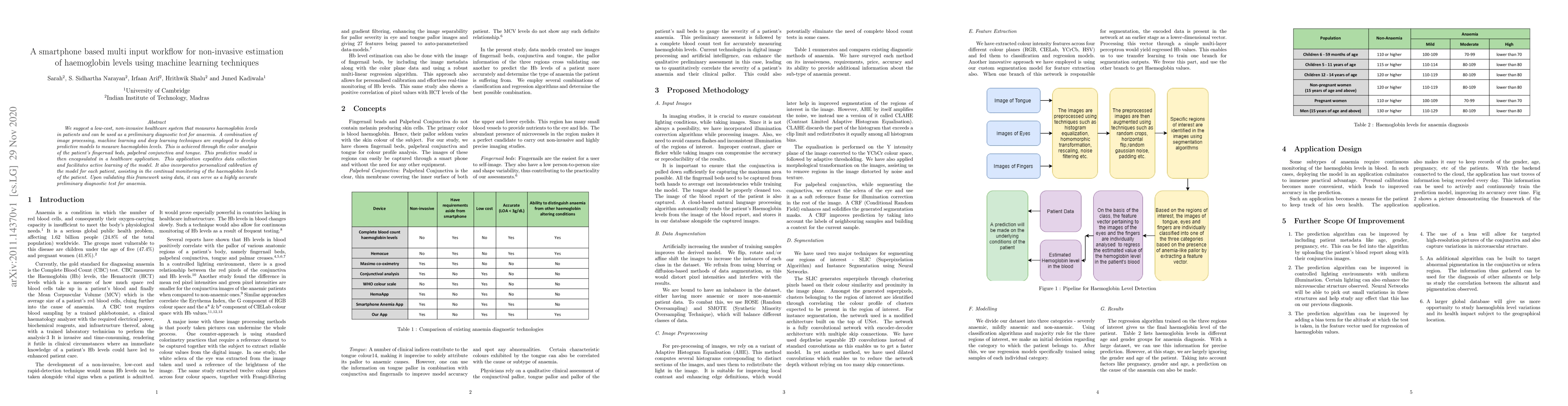 We suggest a low cost, non invasive healthcare system that measures haemoglobin levels in patients and can be used as a preliminary diagnostic test for anaemia. A combination of image processing, machine learning and deep learning techniques are employed to develop predictive models to measure haemoglobin levels. This is achieved through the color analysis of the fingernail beds, palpebral conjunctiva and tongue of the patients. This predictive model is then encapsulated in a healthcare application. This application expedites data collection and facilitates active learning of the model. It also incorporates personalized calibration of the model for each patient, assisting in the continual monitoring of the haemoglobin levels of the patient. Upon validating this framework using data, it can serve as a highly accurate preliminary diagnostic test for anaemia.
