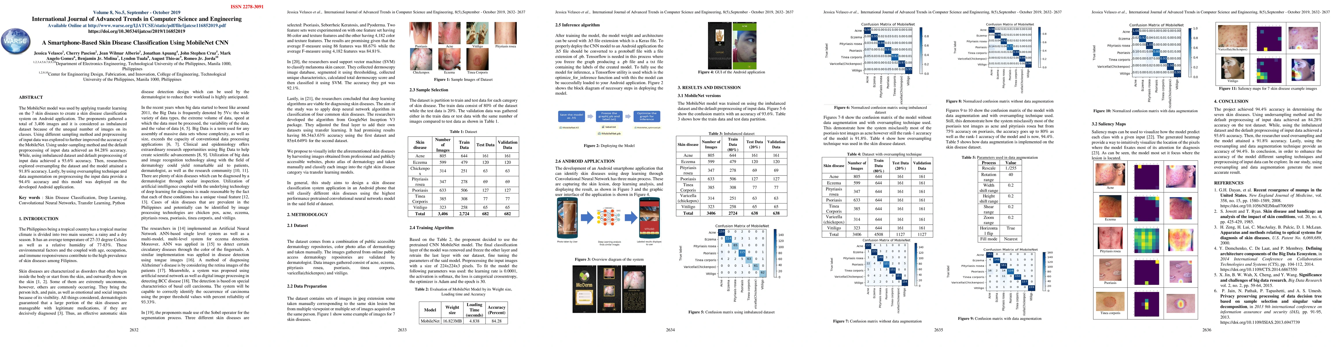 This research developed a smartphone-based skin disease classification system using MobileNet CNN with transfer learning on an Android app. The study achieved up to 94.4% accuracy by employing various sampling methods and data augmentation techniques to address the imbalanced dataset of 3,406 images.