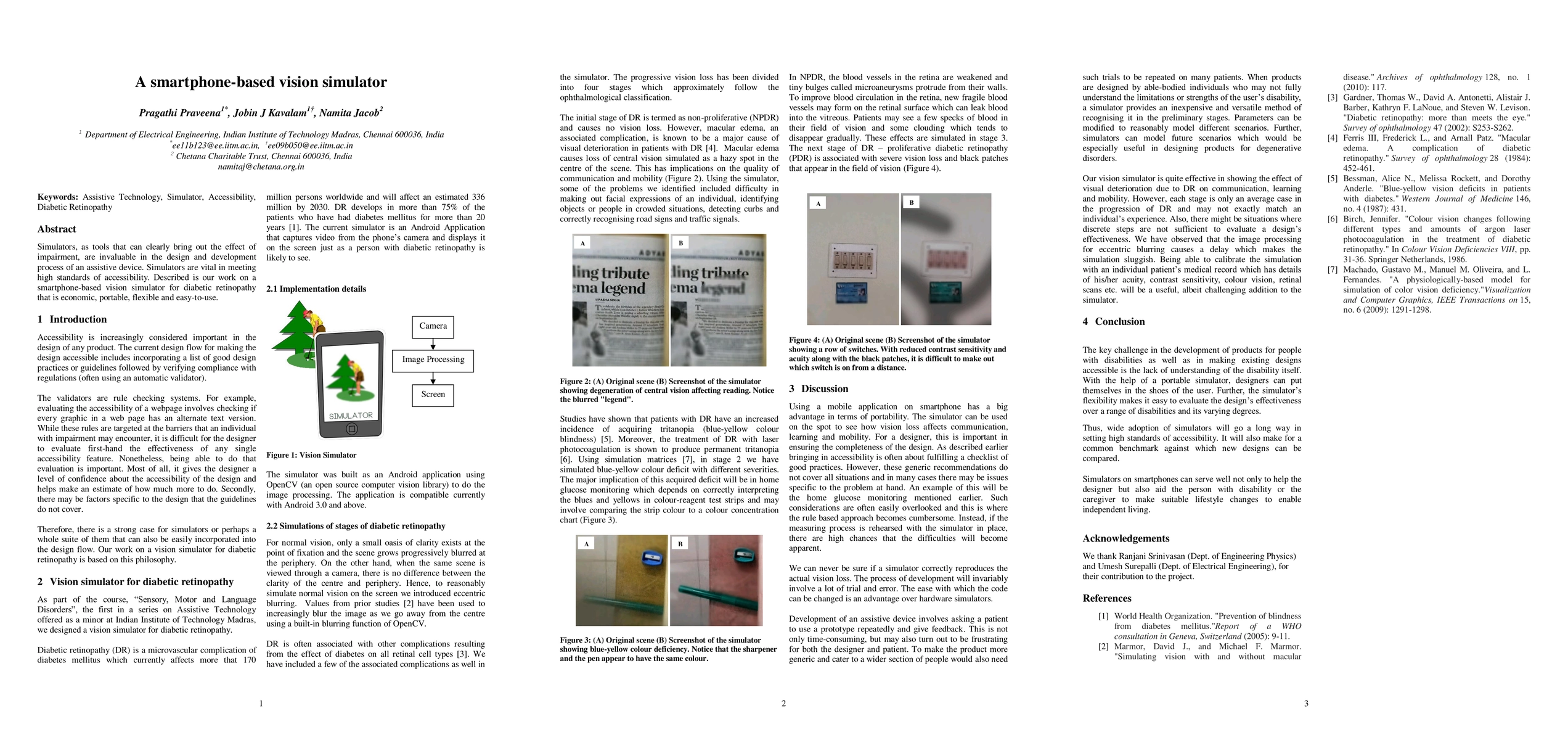 Simulators, as tools that can clearly bring out the effect of impairment, are invaluable in the design and development process of an assistive device. Simulators are vital in meeting high standards of accessibility. Described is our work on a smartphone-based vision simulator for diabetic retinopathy that is economic, portable, flexible and easy-to-use.