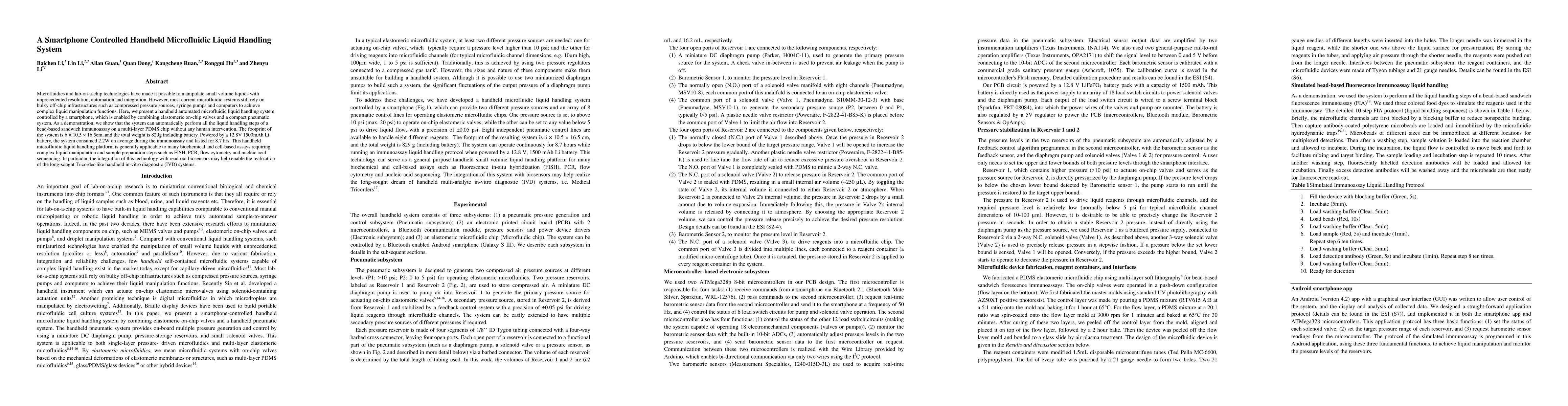 This paper introduces a smartphone-controlled handheld microfluidic liquid handling system that automates complex liquid manipulation tasks using elastomeric on-chip valves and a compact pneumatic system. The system can perform a bead-based sandwich immunoassay without human intervention, demonstrating its potential for biochemical and cell-based assays.