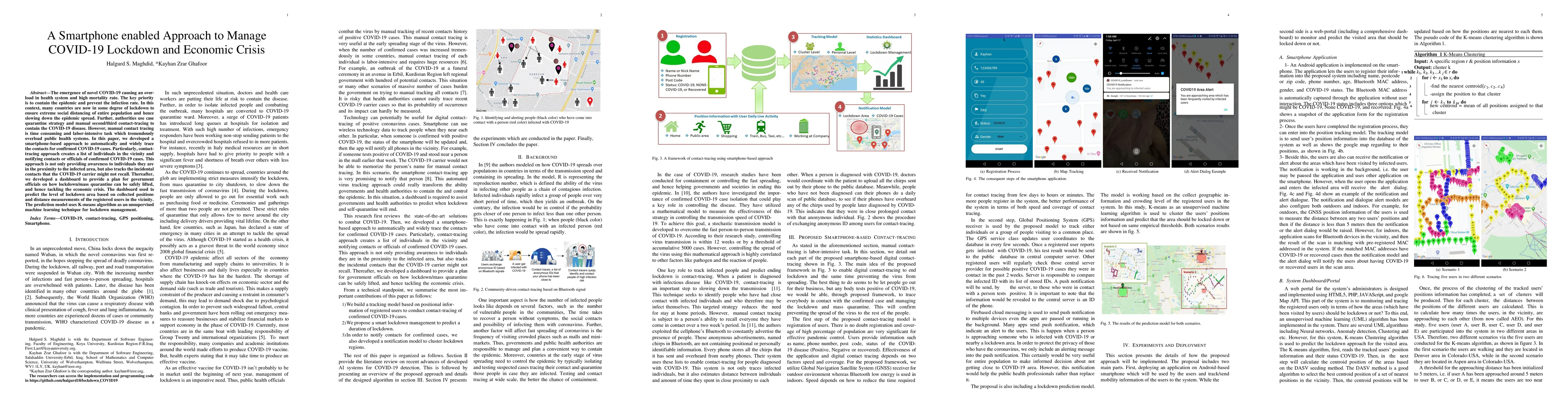 The emergence of novel COVID-19 causing an overload in health system and high mortality rate. The key priority is to contain the epidemic and prevent the infection rate. In this context, many countries are now in some degree of lockdown to ensure extreme social distancing of entire population and hence slowing down the epidemic spread. Further, authorities use case quarantine strategy and manual second/third contact-tracing to contain the COVID-19 disease. However, manual contact tracing is time consuming and labor-intensive task which tremendously overload public health systems. In this paper, we developed a smartphone-based approach to automatically and widely trace the contacts for confirmed COVID-19 cases. Particularly, contact-tracing approach creates a list of individuals in the vicinity and notifying contacts or officials of confirmed COVID-19 cases. This approach is not only providing awareness to individuals they are in the proximity to the infected area, but also tracks the incidental contacts that the COVID-19 carrier might not recall. Thereafter, we developed a dashboard to provide a plan for government officials on how lockdown/mass quarantine can be safely lifted, and hence tackling the economic crisis. The dashboard used to predict the level of lockdown area based on collected positions and distance measurements of the registered users in the vicinity. The prediction model uses K-means algorithm as an unsupervised machine learning technique for lockdown management.