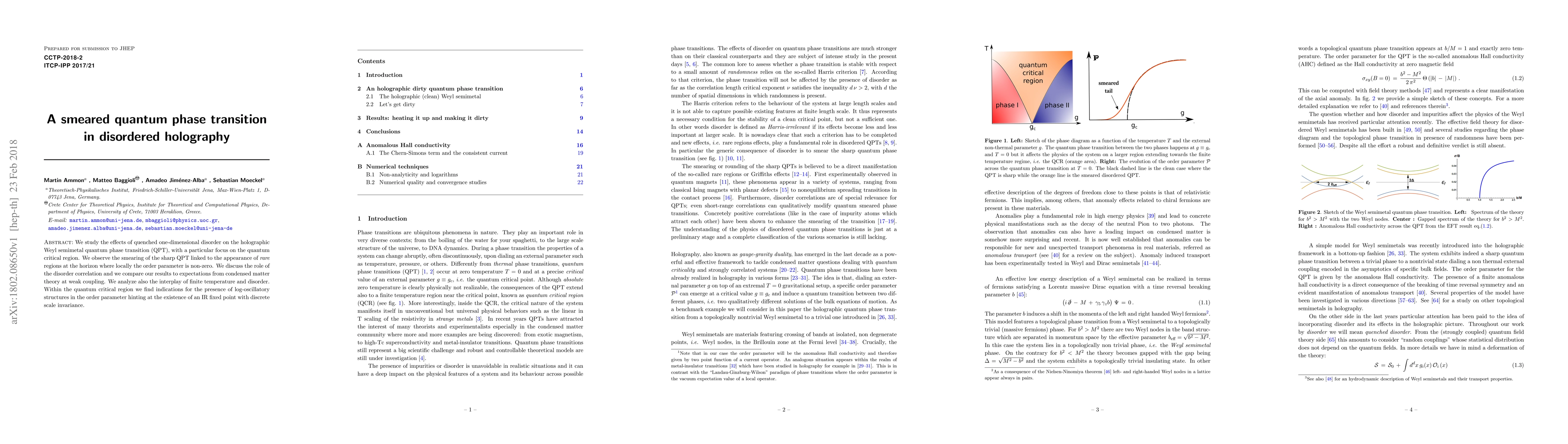 We study the effects of quenched one-dimensional disorder on the holographic Weyl semimetal quantum phase transition (QPT), with a particular focus on the quantum critical region. We observe the smearing of the sharp QPT linked to the appearance of rare regions at the horizon where locally the order parameter is non-zero. We discuss the role of the disorder correlation and we compare our results to expectations from condensed matter theory at weak coupling. We analyze also the interplay of finite temperature and disorder. Within the quantum critical region we find indications for the presence of log-oscillatory structures in the order parameter hinting at the existence of an IR fixed point with discrete scale invariance.