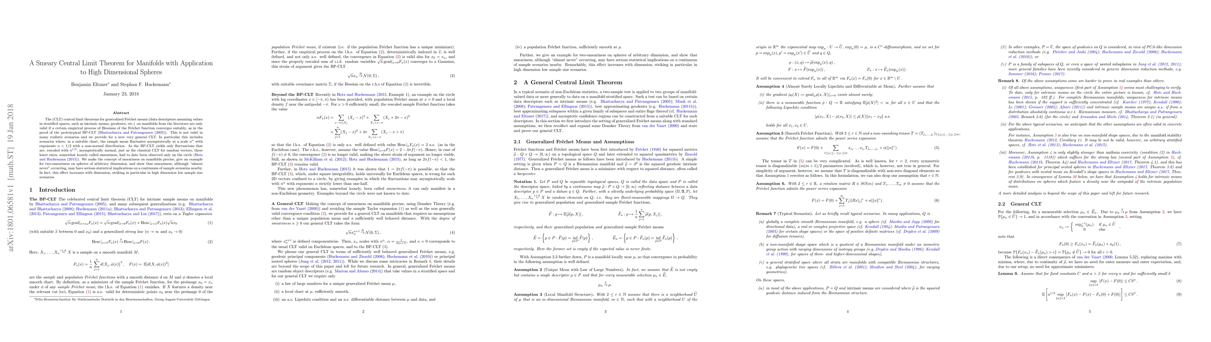 The (CLT) central limit theorems for generalized Frechet means (data descriptors assuming values in stratified spaces, such as intrinsic means, geodesics, etc.) on manifolds from the literature are only valid if a certain empirical process of Hessians of the Frechet function converges suitably, as in the proof of the prototypical BP-CLT (Bhattacharya and Patrangenaru (2005)). This is not valid in many realistic scenarios and we provide for a new very general CLT. In particular this includes scenarios where, in a suitable chart, the sample mean fluctuates asymptotically at a scale $n^{\alpha}$ with exponents ${\alpha} < 1/2$ with a non-normal distribution. As the BP-CLT yields only fluctuations that are, rescaled with $n^{1/2}$ , asymptotically normal, just as the classical CLT for random vectors, these lower rates, somewhat loosely called smeariness, had to date been observed only on the circle (Hotz and Huckemann (2015)). We make the concept of smeariness on manifolds precise, give an example for two-smeariness on spheres of arbitrary dimension, and show that smeariness, although "almost never" occurring, may have serious statistical implications on a continuum of sample scenarios nearby. In fact, this effect increases with dimension, striking in particular in high dimension low sample size scenarios.