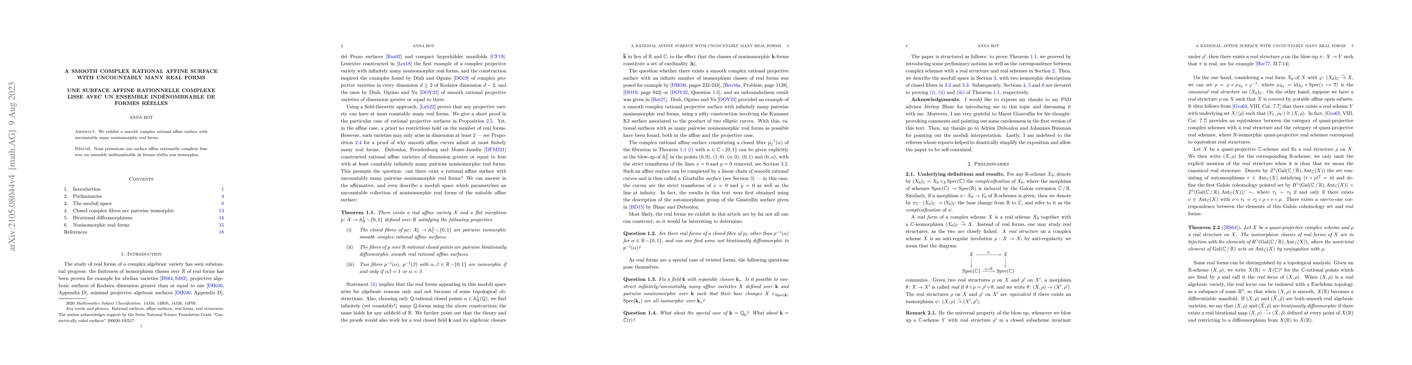 Summary: This paper presents a smooth complex rational affine surface that possesses uncountably many distinct nonisomorphic real forms, illustrating a rich variety in its geometric structures.