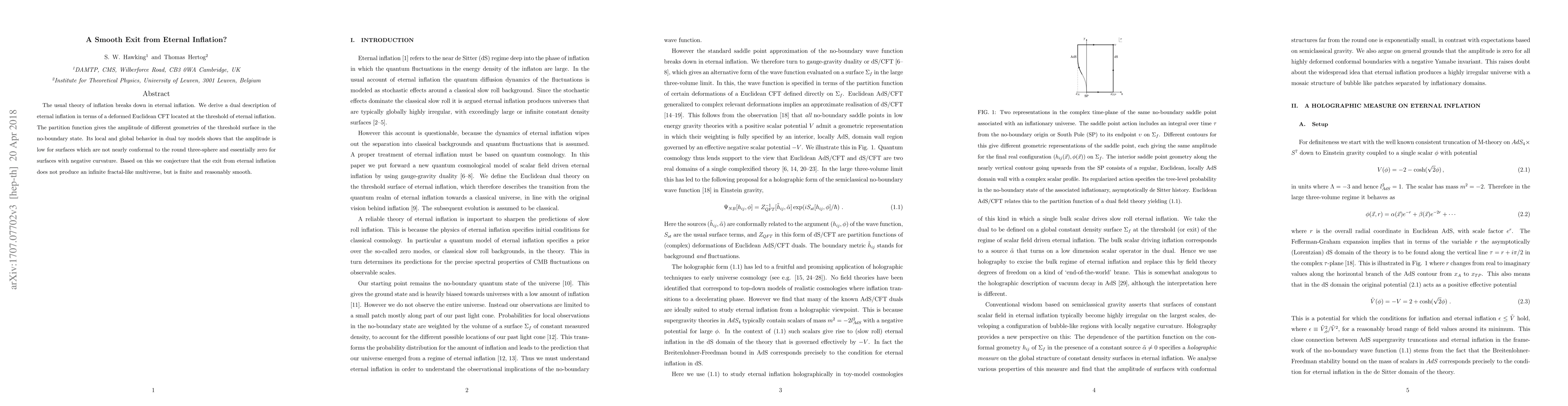 The paper proposes a dual description of eternal inflation using a deformed Euclidean CFT, suggesting that the exit from eternal inflation is finite and smooth rather than producing an infinite multiverse. The partition function indicates low amplitude for non-conformal geometries and essentially zero for negatively curved surfaces.