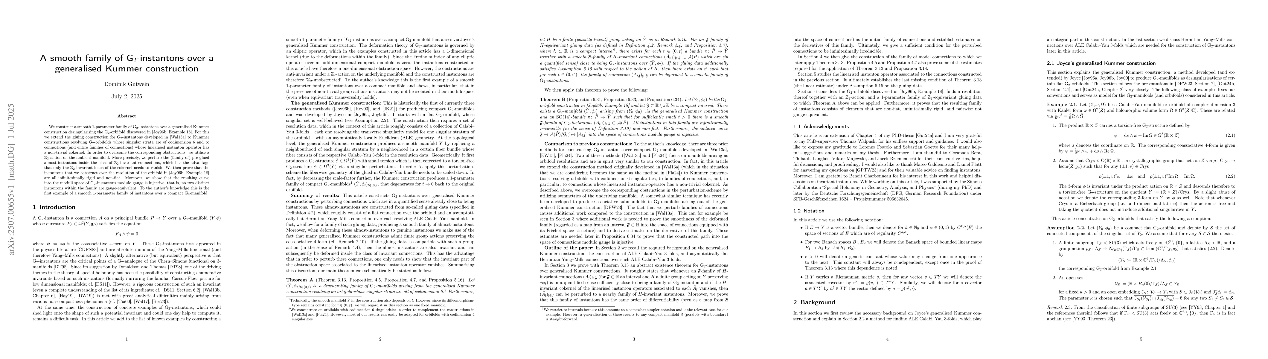 We construct a smooth 1-parameter family of $G_2$-instantons over a generalised Kummer construction desingularising a $G_2$-orbifold discovered by Joyce. For this we extend the gluing construction for $G_2$-instantons developed by Walpuski to Kummer constructions resolving $G_2$-orbifolds whose singular strata are of codimension 6 and to connections (and entire families of connections) whose linearised instanton operator has a non-trivial cokernel. In order to overcome the corresponding obstructions, we utilise a $\mathbb{Z}_2$-action on the ambient manifold. More precisely, we perturb the (family of) pre-glued almost-instantons inside the class of $\mathbb{Z}_2$-invariant connections, which has the advantage that only the $\mathbb{Z}_2$-invariant locus of the cokernel needs to vanish. We then prove that the instantons that we construct over the resolution of the orbifold found by Joyce are all infinitesimally rigid and non-flat. Moreover, we show that the resulting curve into the moduli space of $G_2$-instantons modulo gauge is injective, that is, no two distinct instantons within the family are gauge-equivalent. To the author's knowledge this is the first example of a smooth 1-parameter family of instantons over a compact $G_2$-manifold.