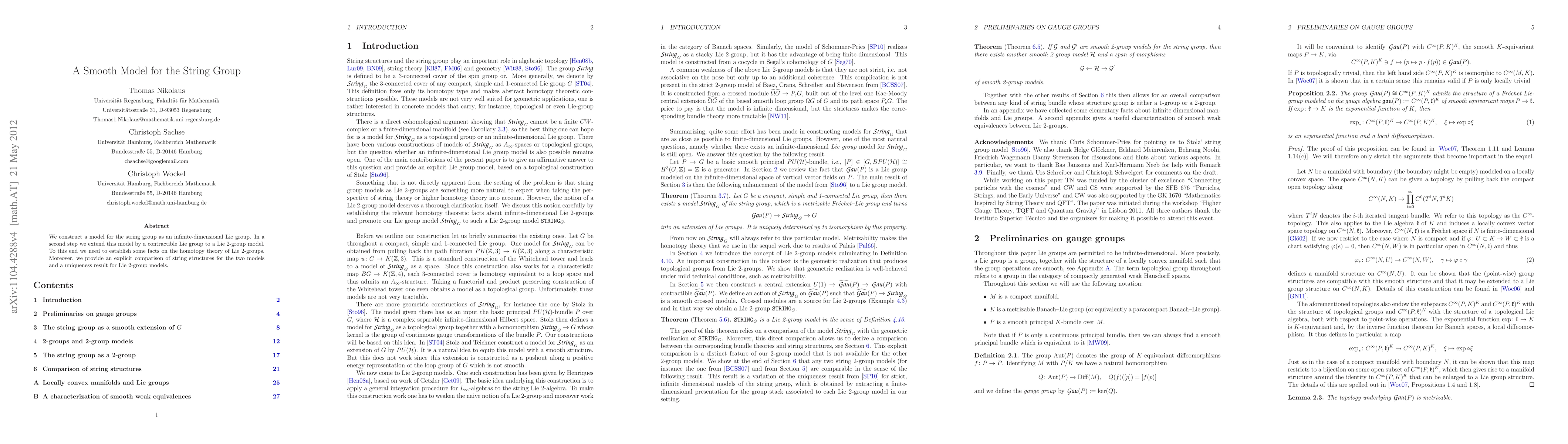 We construct a model for the string group as an infinite-dimensional Lie group. In a second step we extend this model by a contractible Lie group to a Lie 2-group model. To this end we need to establish some facts on the homotopy theory of Lie 2-groups. Moreover, we provide an explicit comparison of string structures for the two models and a uniqueness result for Lie 2-group models.
