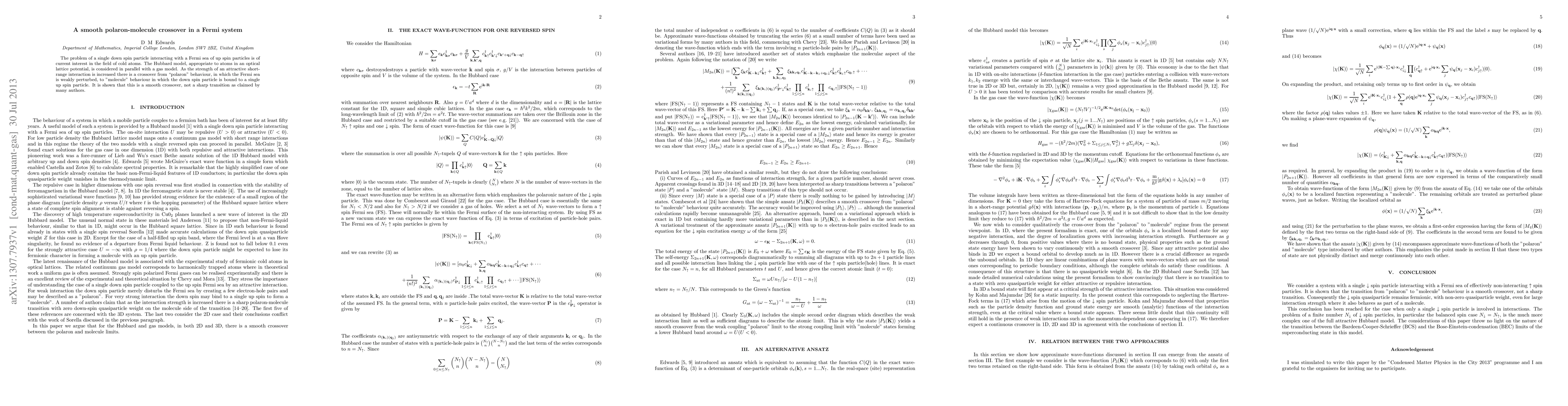 The problem of a single down spin particle interacting with a Fermi sea of up spin particles is of current interest in the field of cold atoms. The Hubbard model, appropriate to atoms in an optical lattice potential, is considered in parallel with a gas model. As the strength of an attractive short-range interaction is increased there is a crossover from "polaron" behaviour, in which the Fermi sea is weakly perturbed, to "molecule" behaviour in which the down spin particle is bound to a single up spin particle. It is shown that this is a smooth crossover, not a sharp transition as claimed by many authors.