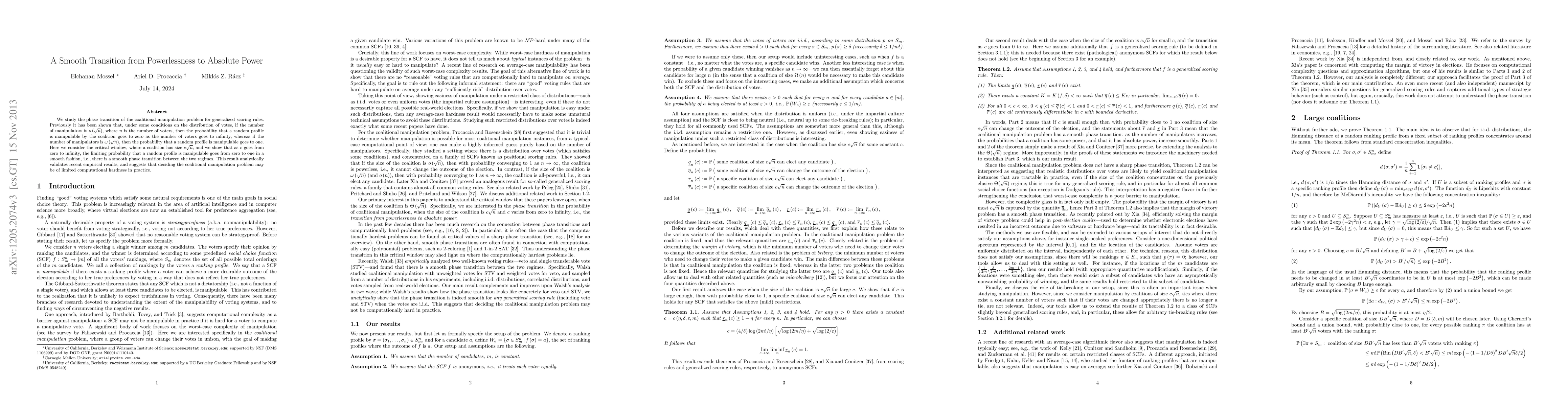 We study the phase transition of the coalitional manipulation problem for generalized scoring rules. Previously it has been shown that, under some conditions on the distribution of votes, if the number of manipulators is $o(\sqrt{n})$, where $n$ is the number of voters, then the probability that a random profile is manipulable by the coalition goes to zero as the number of voters goes to infinity, whereas if the number of manipulators is $\omega(\sqrt{n})$, then the probability that a random profile is manipulable goes to one. Here we consider the critical window, where a coalition has size $c\sqrt{n}$, and we show that as $c$ goes from zero to infinity, the limiting probability that a random profile is manipulable goes from zero to one in a smooth fashion, i.e., there is a smooth phase transition between the two regimes. This result analytically validates recent empirical results, and suggests that deciding the coalitional manipulation problem may be of limited computational hardness in practice.