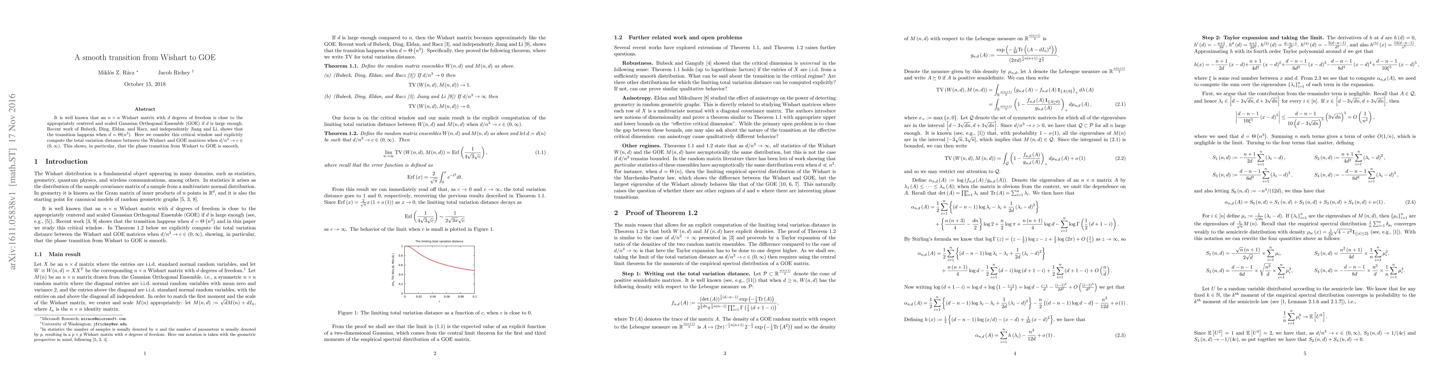 It is well known that an $n \times n$ Wishart matrix with $d$ degrees of freedom is close to the appropriately centered and scaled Gaussian Orthogonal Ensemble (GOE) if $d$ is large enough. Recent work of Bubeck, Ding, Eldan, and Racz, and independently Jiang and Li, shows that the transition happens when $d = \Theta ( n^{3} )$. Here we consider this critical window and explicitly compute the total variation distance between the Wishart and GOE matrices when $d / n^{3} \to c \in (0, \infty)$. This shows, in particular, that the phase transition from Wishart to GOE is smooth.