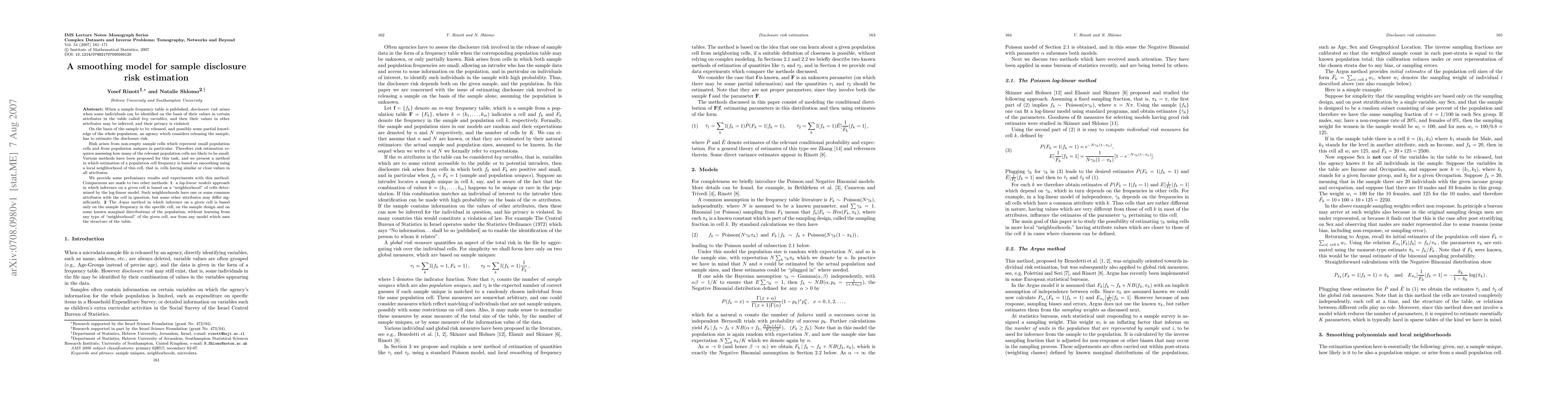 The paper proposes a smoothing model for estimating sample disclosure risk, utilizing local neighborhoods of a given cell based on similar attribute values. It compares this method to log-linear models and the Argus method, which doesn't use neighborhoods.