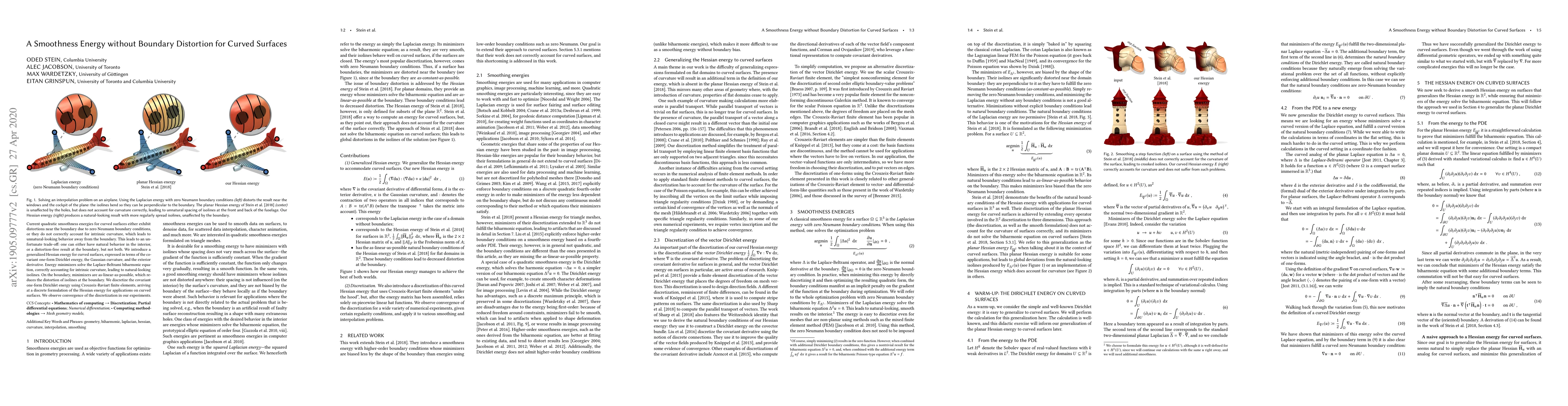This paper introduces a novel smoothness energy for curved surfaces that resolves distortions near boundaries and accurately accounts for intrinsic curvature, avoiding unnatural behavior. The proposed generalized Hessian energy minimizes the Laplace-Beltrami biharmonic equation, ensuring natural isolines and reduced boundary distortion, and is discretized using Crouzeix-Raviart finite elements with observed convergence.