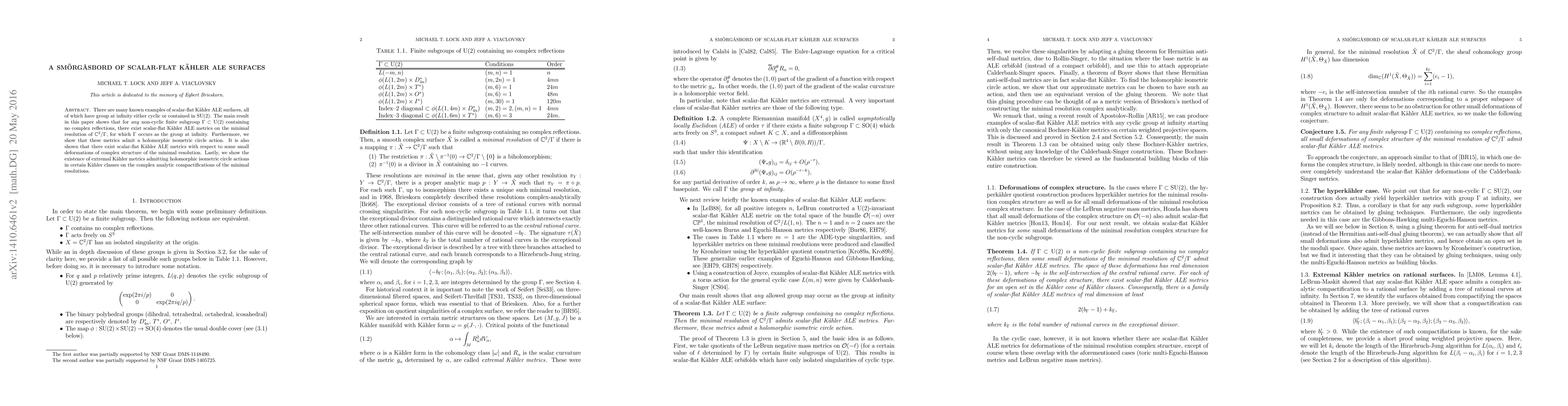 The paper introduces a method for constructing scalar-flat Kähler ALE metrics with non-cyclic finite subgroups of U(2) as groups at infinity, utilizing holomorphic isometric circle actions and small deformations of complex structures.