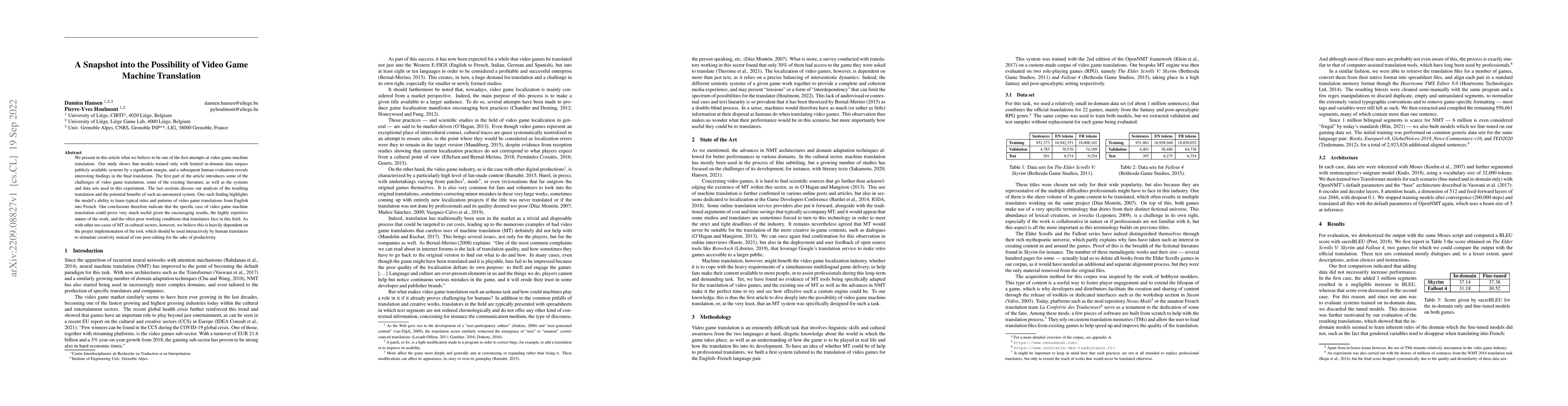 We present in this article what we believe to be one of the first attempts at video game machine translation. Our study shows that models trained only with limited in-domain data surpass publicly available systems by a significant margin, and a subsequent human evaluation reveals interesting findings in the final translation. The first part of the article introduces some of the challenges of video game translation, some of the existing literature, as well as the systems and data sets used in this experiment. The last sections discuss our analysis of the resulting translation and the potential benefits of such an automated system. One such finding highlights the model's ability to learn typical rules and patterns of video game translations from English into French. Our conclusions therefore indicate that the specific case of video game machine translation could prove very much useful given the encouraging results, the highly repetitive nature of the work, and the often poor working conditions that translators face in this field. As with other use cases of MT in cultural sectors, however, we believe this is heavily dependent on the proper implementation of the tool, which should be used interactively by human translators to stimulate creativity instead of raw post-editing for the sake of productivity.