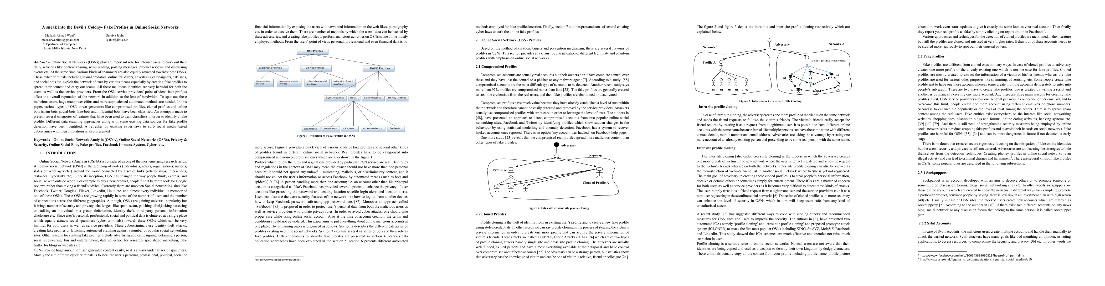 This paper explores the threat of fake profiles in online social networks, categorizing various types of malicious entities like spammers and social bots. It discusses methods for detecting these profiles and reviews existing legal frameworks to combat social media-based cybercrimes.