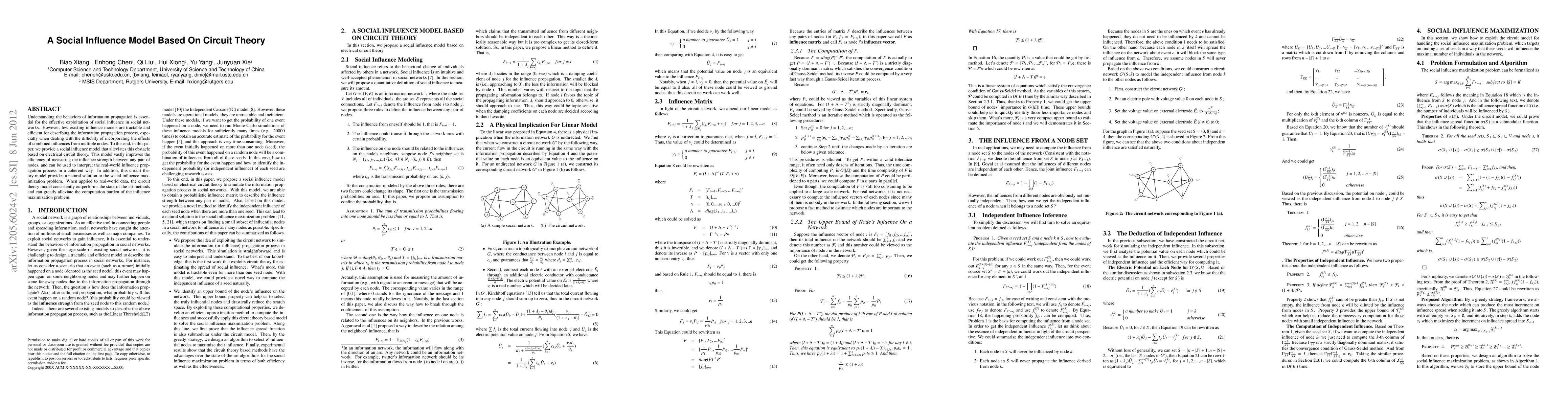 Understanding the behaviors of information propagation is essential for the effective exploitation of social influence in social networks. However, few existing influence models are tractable and efficient for describing the information propagation process, especially when dealing with the difficulty of incorporating the effects of combined influences from multiple nodes. To this end, in this paper, we provide a social influence model that alleviates this obstacle based on electrical circuit theory. This model vastly improves the efficiency of measuring the influence strength between any pair of nodes, and can be used to interpret the real-world influence propagation process in a coherent way. In addition, this circuit theory model provides a natural solution to the social influence maximization problem. When applied to realworld data, the circuit theory model consistently outperforms the state-of-the-art methods and can greatly alleviate the computation burden of the influence maximization problem.