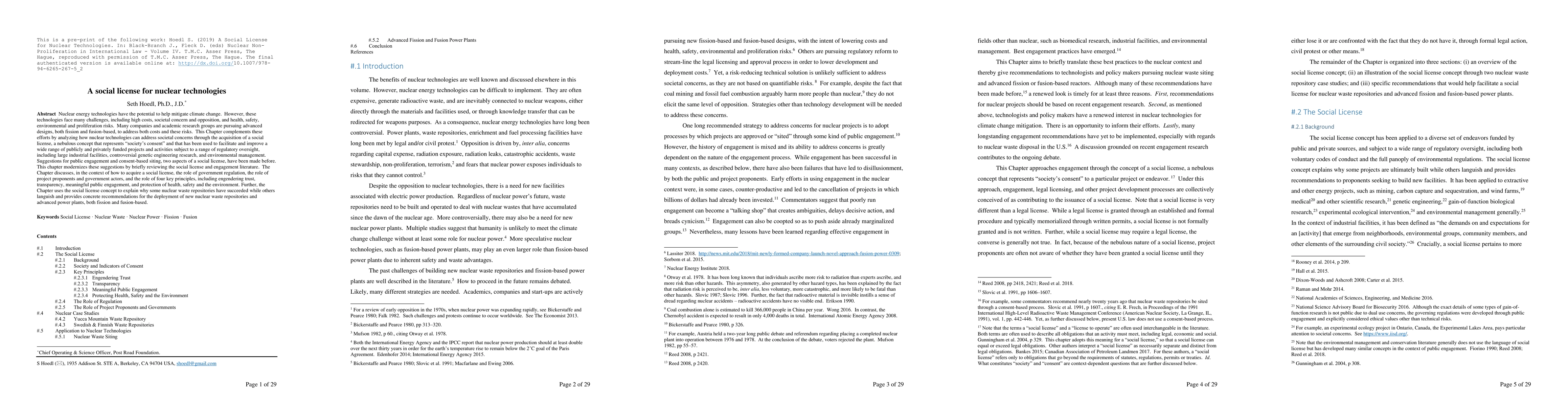 Nuclear energy technologies have the potential to help mitigate climate change. However, these technologies face many challenges, including high costs, societal concern and opposition, and health, safety, environmental and proliferation risks. Many companies and academic research groups are pursuing advanced designs, both fission and fusion-based, to address both costs and these risks. This Chapter complements these efforts by analyzing how nuclear technologies can address societal concerns through the acquisition of a social license, a nebulous concept that represents "society's consent" and that has been used to facilitate and improve a wide range of publicly and privately funded projects and activities subject to a range of regulatory oversight, including large industrial facilities, controversial genetic engineering research, and environmental management. Suggestions for public engagement and consent-based siting, two aspects of a social license, have been made before. This chapter modernizes these suggestions by briefly reviewing the social license and engagement literature. The Chapter discusses, in the context of how to acquire a social license, the role of government regulation, the role of project proponents and government actors, and the role of four key principles, including engendering trust, transparency, meaningful public engagement, and protection of health, safety and the environment. Further, the Chapter uses the social license concept to explain why some nuclear waste repositories have succeeded while others languish and provides concrete recommendations for the deployment of new nuclear waste repositories and advanced power plants, both fission and fusion-based.