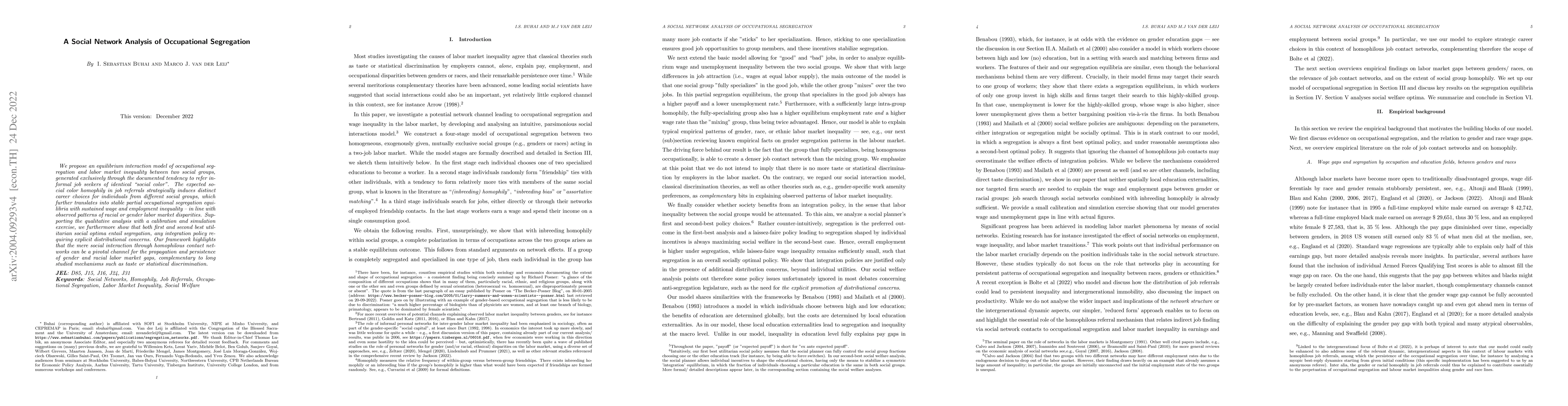This paper develops an equilibrium interaction model to explain occupational segregation and labor market inequality through social color homophily in job referrals, showing how this perpetuates wage and employment disparities. Simulation results indicate that segregation persists even under optimal social policies, emphasizing the role of social networks in sustaining labor market gaps.