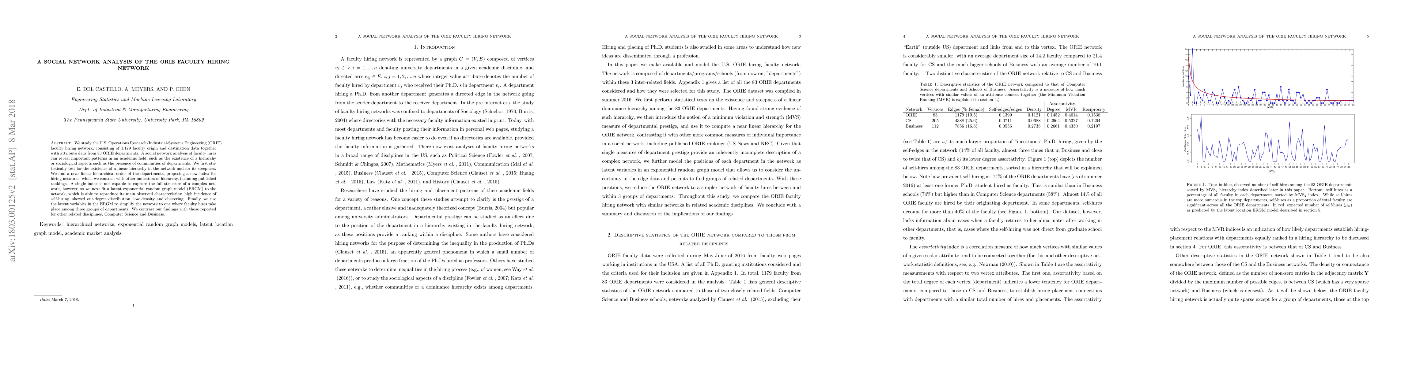 We study the U.S. Operations Research/Industrial-Systems Engineering (ORIE) faculty hiring network, consisting of 1,179 faculty origin and destination data together with attribute data from 83 ORIE departments. A social network analysis of faculty hires can reveal important patterns in an academic field, such as the existence of a hierarchy or sociological aspects such as the presence of communities of departments. We first statistically test for the existence of a linear hierarchy in the network and for its steepness. We find a near linear hierarchical order of the departments, proposing a new index for hiring networks, which we contrast with other indicators of hierarchy, including published rankings. A single index is not capable to capture the full structure of a complex network, however, so we next fit a latent exponential random graph model (ERGM) to the network, which is able to reproduce its main observed characteristics: high incidence of self-hiring, skewed out-degree distribution, low density and clustering. Finally, we use the latent variables in the ERGM to simplify the network to one where faculty hires take place among three groups of departments. We contrast our findings with those reported for other related disciplines, Computer Science and Business.