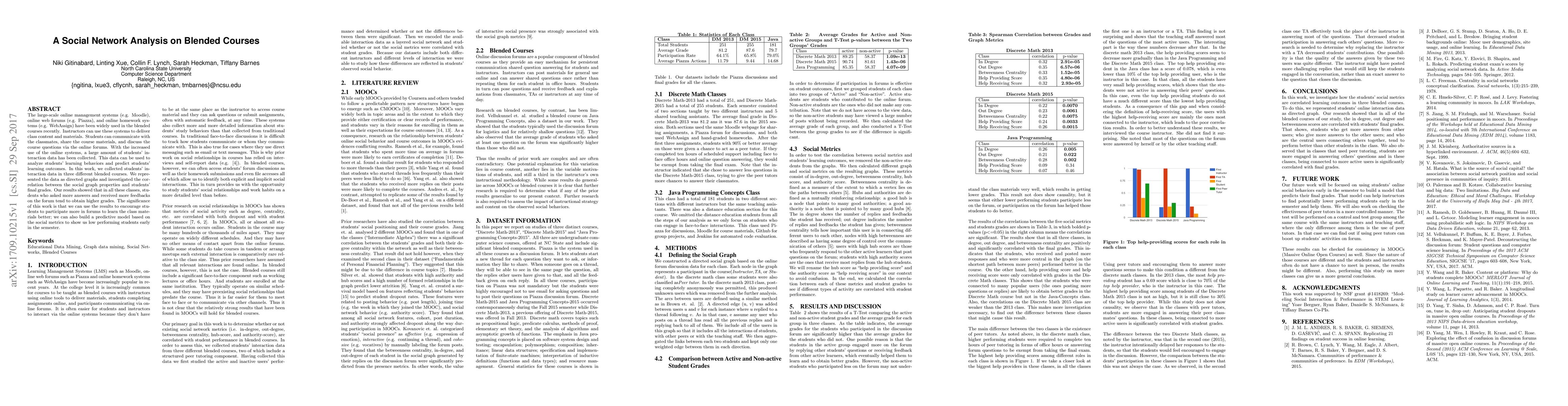 The paper presents a novel approach to analyzing students' social network interactions in blended courses using graph theory and social metrics to correlate with learning outcomes.