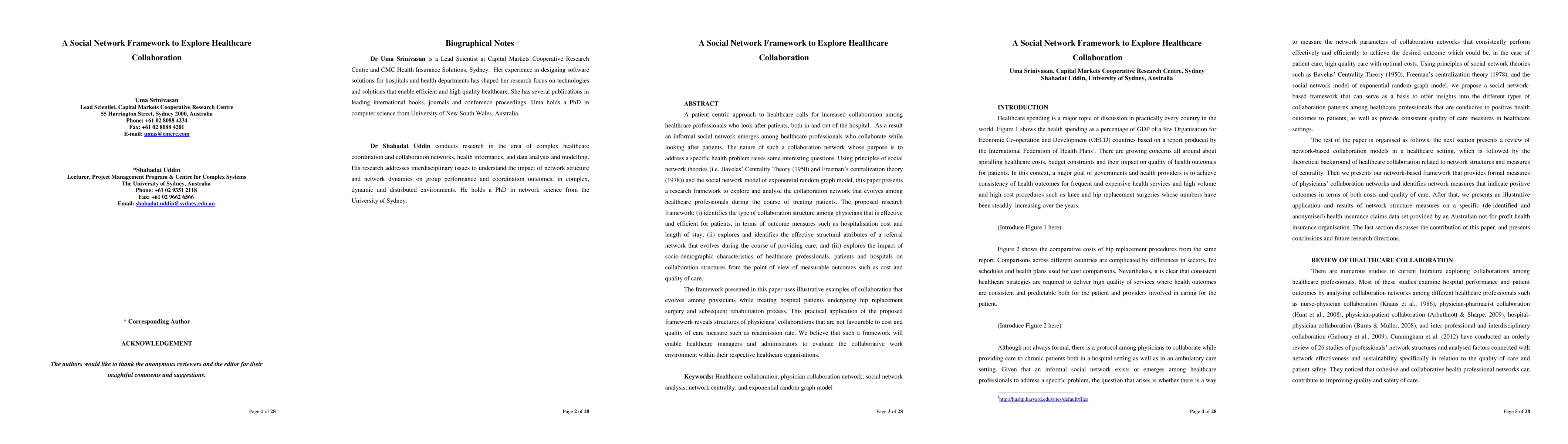 A patient-centric approach to healthcare leads to an informal social network among medical professionals. This chapter presents a research framework to: identify the collaboration structure among physicians that is effective and efficient for patients, discover effective structural attributes of a collaboration network that evolves during the course of providing care, and explore the impact of socio-demographic characteristics of healthcare professionals, patients, and hospitals on collaboration structures, from the point of view of measurable outcomes such as cost and quality of care. The framework uses illustrative examples drawn from a data set of patients undergoing hip replacement surgery.