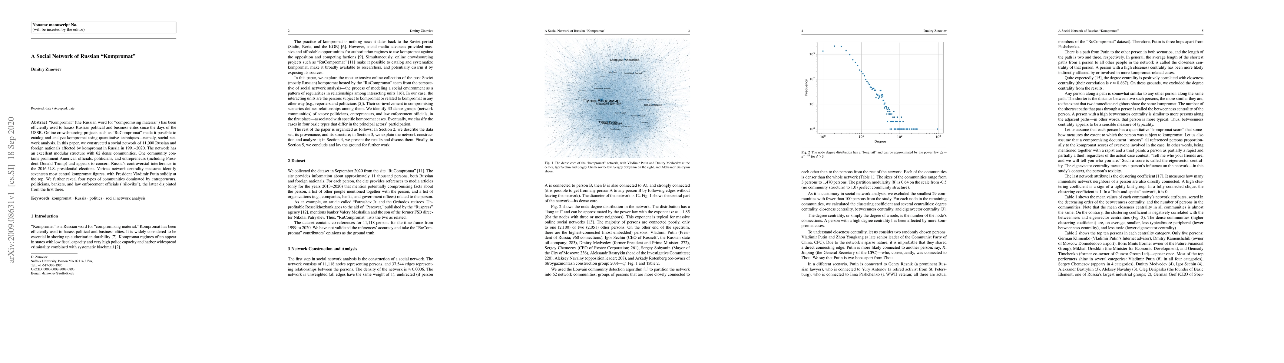 Researchers analyzed a social network of 11,000 individuals affected by kompromat in Russia from 1991 to 2020, revealing connections between prominent figures including President Vladimir Putin and American officials, with four distinct communities dominated by entrepreneurs, politicians, and law enforcement officials.
