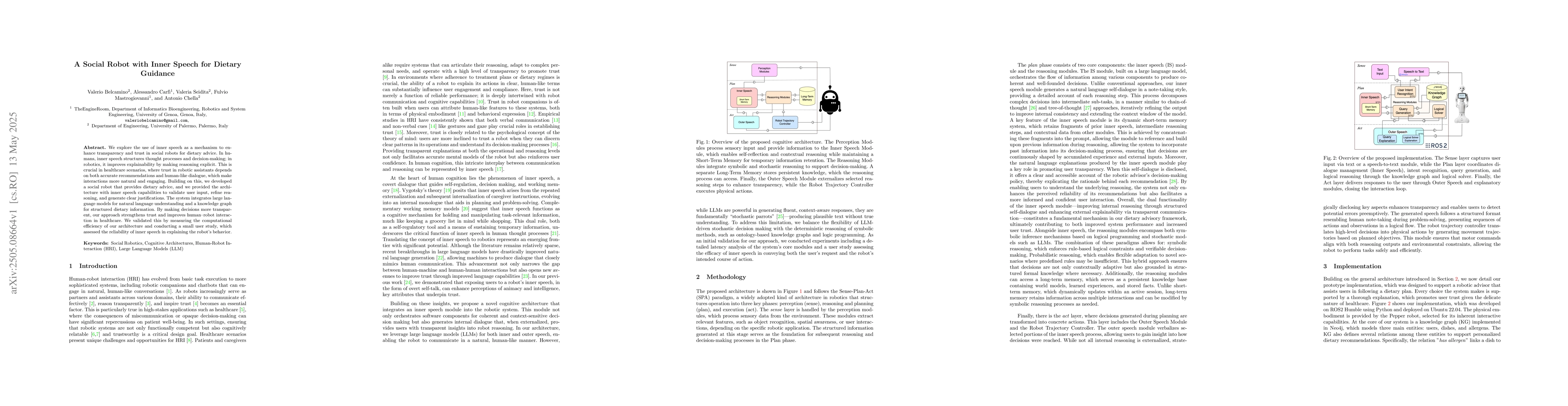 This work is novel in applying inner speech to social robots for healthcare, specifically for dietary guidance, enhancing transparency and trust in human-robot interactions.