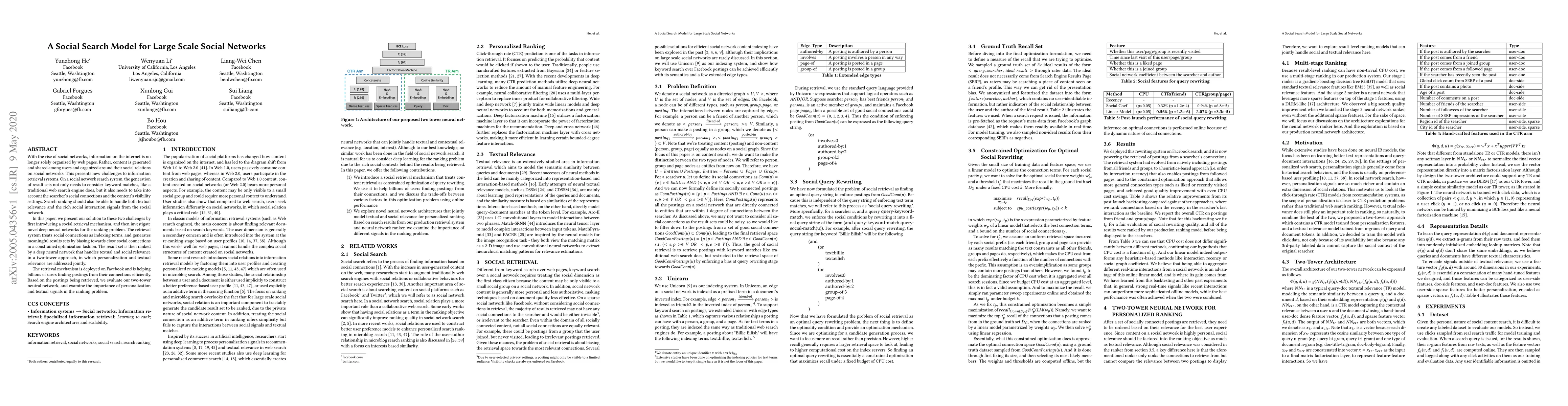 This paper proposes a social search model for large-scale social networks, integrating social connections and content visibility into search results. It employs a social retrieval mechanism and a deep neural network for ranking, demonstrating effective deployment on Facebook.