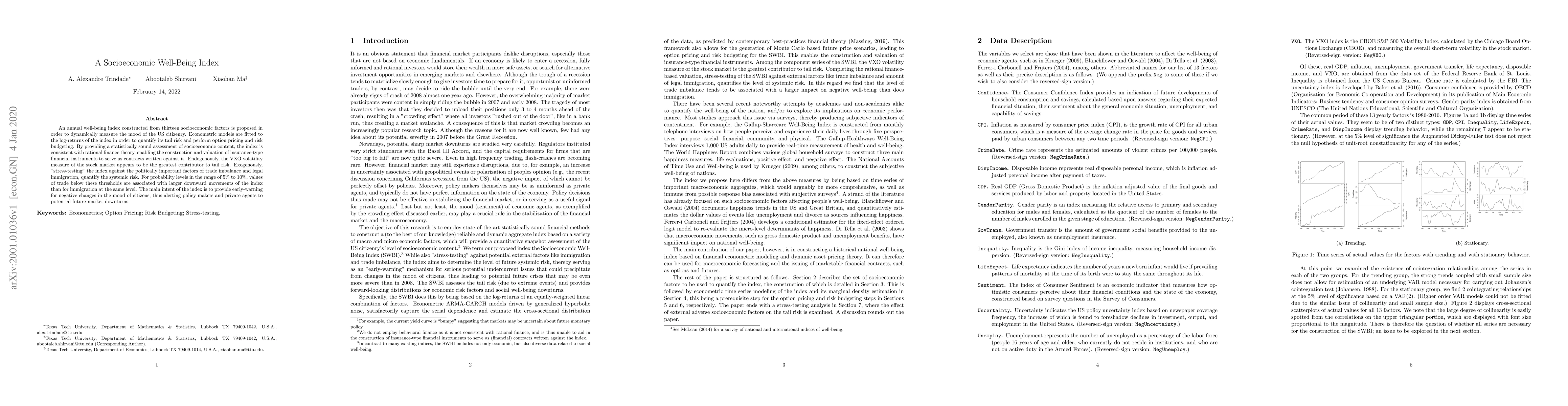 An annual well-being index constructed from thirteen socioeconomic factors is proposed in order to dynamically measure the mood of the US citizenry. Econometric models are fitted to the log-returns of the index in order to quantify its tail risk and perform option pricing and risk budgeting. By providing a statistically sound assessment of socioeconomic content, the index is consistent with rational finance theory, enabling the construction and valuation of insurance-type financial instruments to serve as contracts written against it. Endogenously, the VXO volatility measure of the stock market appears to be the greatest contributor to tail risk. Exogenously, "stress-testing" the index against the politically important factors of trade imbalance and legal immigration, quantify the systemic risk. For probability levels in the range of 5% to 10%, values of trade below these thresholds are associated with larger downward movements of the index than for immigration at the same level. The main intent of the index is to provide early-warning for negative changes in the mood of citizens, thus alerting policy makers and private agents to potential future market downturns.