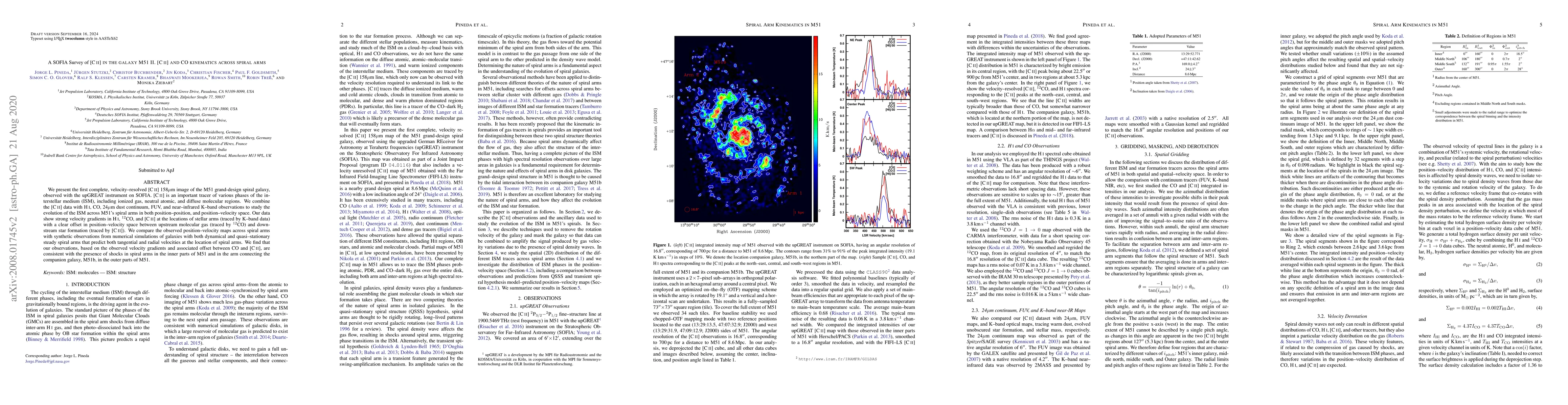 We present the first complete, velocity-resolved [CII] 158um image of the M51 grand-design spiral galaxy, observed with the upGREAT instrument on SOFIA. [CII] is an important tracer of various phases of the interstellar medium (ISM), including ionized gas, neutral atomic, and diffuse molecular regions. We combine the [CII] data with HI, CO, 24um dust continuum, FUV, and near-infrared K-band observations to study the evolution of the ISM across M51's spiral arms in both position-position, and position-velocity space. Our data show strong velocity gradients in HI, 12CO, and [CII] at the locations of stellar arms (traced by K--band data) with a clear offset in position-velocity space between upstream molecular gas (traced by 12CO) and downstream star formation (traced by [CII]). We compare the observed position--velocity maps across spiral arms with synthetic observations from numerical simulations of galaxies with both dynamical and quasi-stationary steady spiral arms that predict both tangential and radial velocities at the location of spiral arms. We find that our observations, based on the observed velocity gradients and associated offset between CO and [CII], are consistent with the presence of shocks in spiral arms in the inner parts of M51 and in the arm connecting the companion galaxy, M51b, in the outer parts of M51.