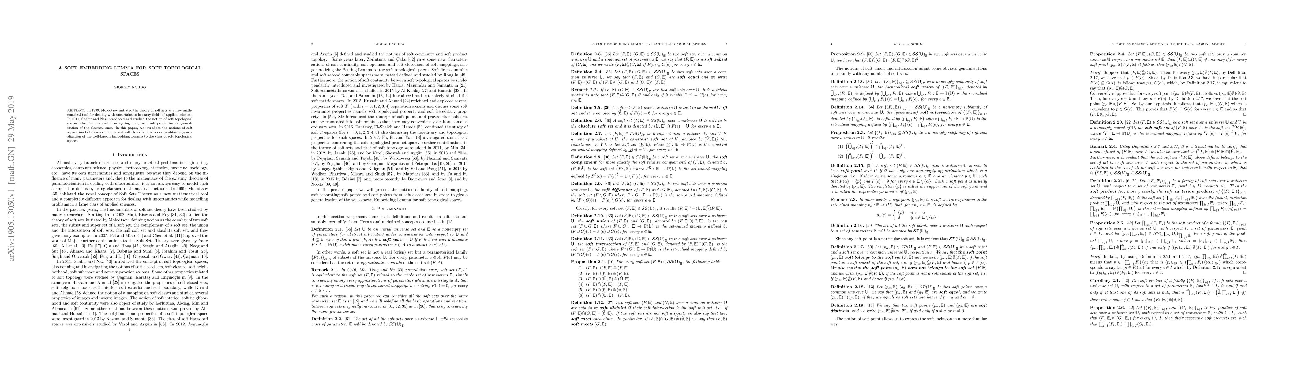 This paper presents a generalization of the Embedding Lemma to soft topological spaces by introducing the concepts of soft separation between points and soft closed sets, expanding on the theory of soft sets initiated by Molodtsov and further developed by Shabir and Naz.