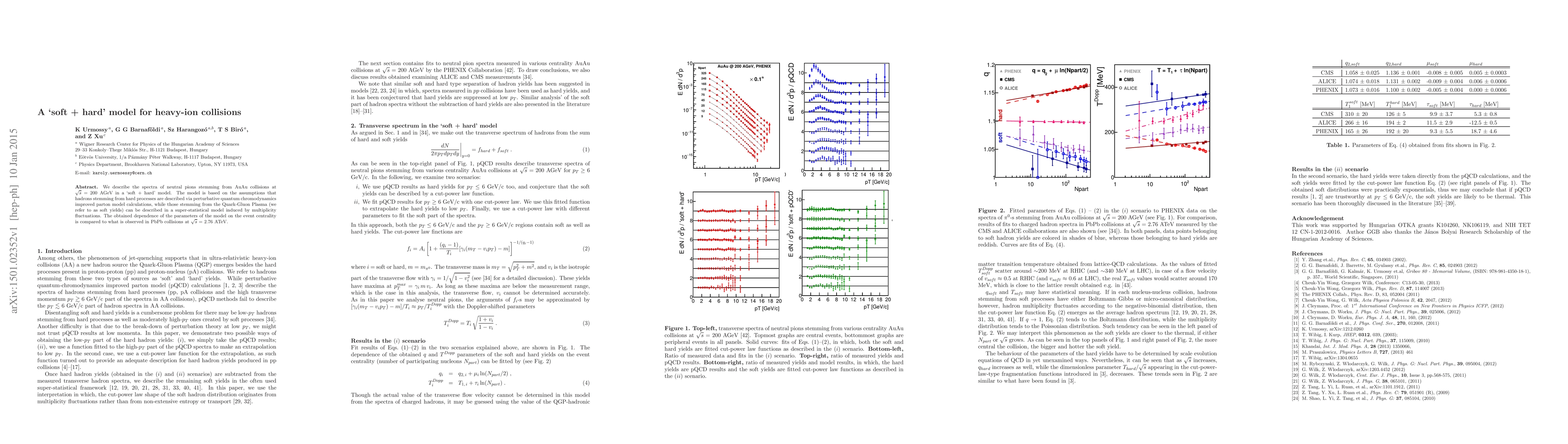We describe the spectra of neutral pions stemming from AuAu collisions at $\sqrt s$ = 200 AGeV in a `soft + hard' model. The model is based on the assumptions that hadrons stemming from hard processes are described via perturbative quantum chromodynamics improved parton model calculations, while those stemming from the Quark-Gluon Plasma (we refer to as soft yields) can be described in a super-statistical model induced by multiplicity fluctuations. The obtained dependence of the parameters of the model on the event centrality is compared to what is observed in PbPb collisions at $\sqrt s$ = 2.76 ATeV.