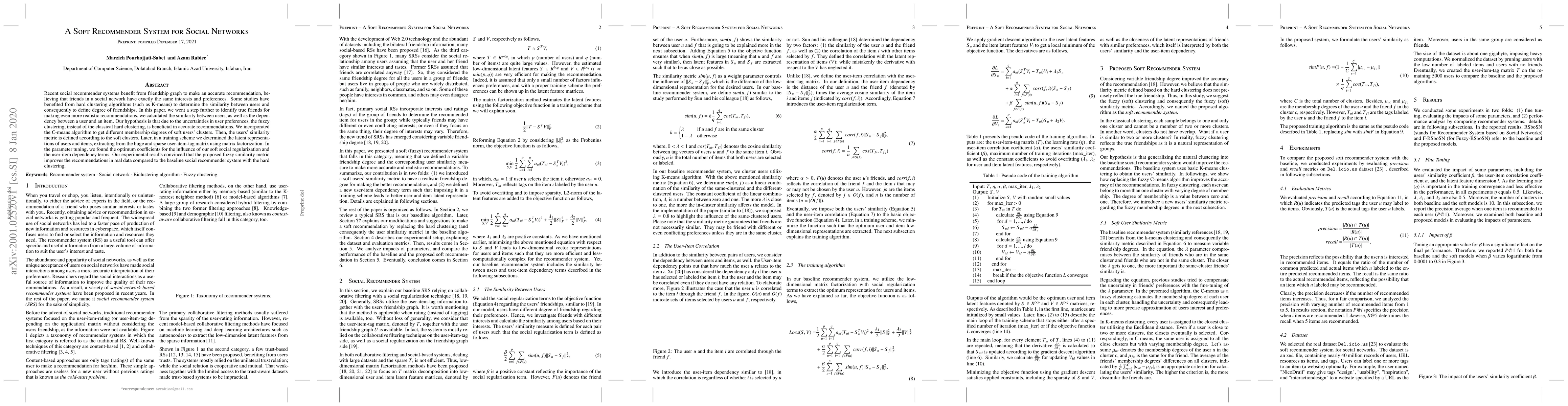 This paper proposes a soft recommender system for social networks that uses fuzzy clustering (C-means) to better identify true friends based on user preferences and item dependencies, leading to more accurate recommendations compared to traditional hard clustering methods. Experimental results show improved performance over baseline systems.