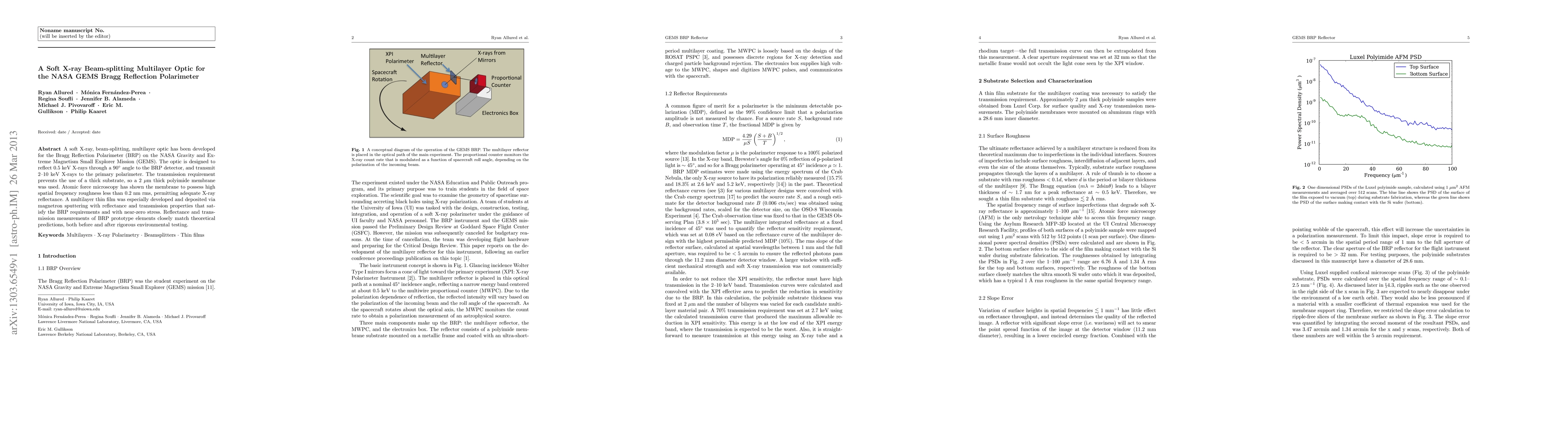 A soft X-ray, beam-splitting, multilayer optic has been developed for the Bragg Reflection Polarimeter (BRP) on the NASA Gravity and Extreme Magnetism Small Explorer Mission (GEMS). The optic is designed to reflect 0.5 keV X-rays through a 90 degree angle to the BRP detector, and transmit 2-10 keV X-rays to the primary polarimeter. The transmission requirement prevents the use of a thick substrate, so a 2 micron thick polyimide membrane was used. Atomic force microscopy has shown the membrane to possess high spatial frequency roughness less than 0.2 nm rms, permitting adequate X-ray reflectance. A multilayer thin film was especially developed and deposited via magnetron sputtering with reflectance and transmission properties that satisfy the BRP requirements and with near-zero stress. Reflectance and transmission measurements of BRP prototype elements closely match theoretical predictions, both before and after rigorous environmental testing.